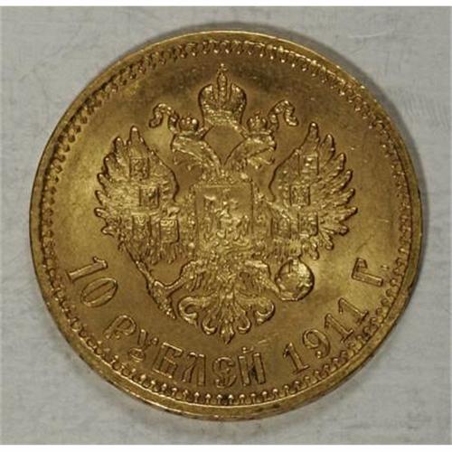 <B>Nicholas II. Gold 10 Roubles 1911 ??,</B></I> Bit-16, KM64, lustrous XF and a scarcer issue with a mintage of only 50,011 pieces. <BR><BR><b>Shipping:</b> Coins & Currency (<a target="_blank" href="http://www.heritageauctions.com/common/shipping.php">view shipping information</a>)