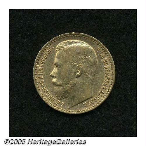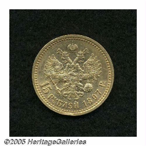 <B>Nicholas II Gold 15 Rubles 1897,</B></I> Fr-177, KM-Y65.1, XF with a couple of rim bumps. A scarce one-year type.