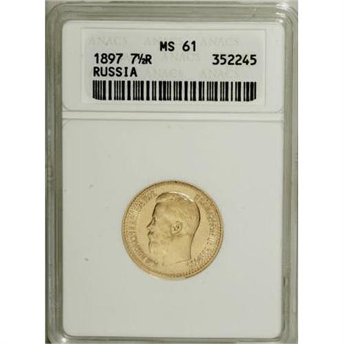 <B>Nicholas II. Gold 7-1/2 Roubles 1897 A?, </B></I> Bit-17, KM63, MS61 ANACS.<BR><BR><b>Shipping:</b> Coins & Currency (<a target="_blank" href="http://www.heritageauctions.com/common/shipping.php">view shipping information</a>)