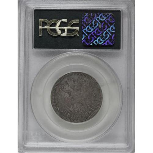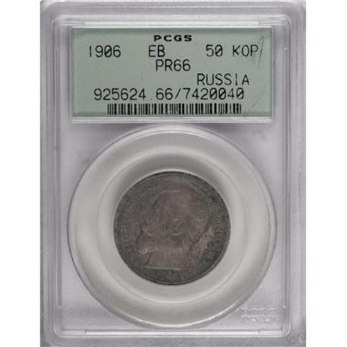 <B>Nicholas II. Proof 50 Kopecks 1906 ??, </B></I> Bust left/Imperial eagle with date and value, Bit-85 (R1), Proof 66 PCGS. Deeply mirrored fields beneath heavy greenish-gray toning. A very rare issue. The regular issue of this date has the second lowest regular issue mintage of the type with only 10,009 pieces minted. There appears to be no record of the Proof mintage, but it is undoubtedly very small as Proofs appear very infrequently. <BR><BR><b>Shipping:</b> Coins & Currency (<a target="_blank" href="http://www.heritageauctions.com/common/shipping.php">view shipping information</a>)