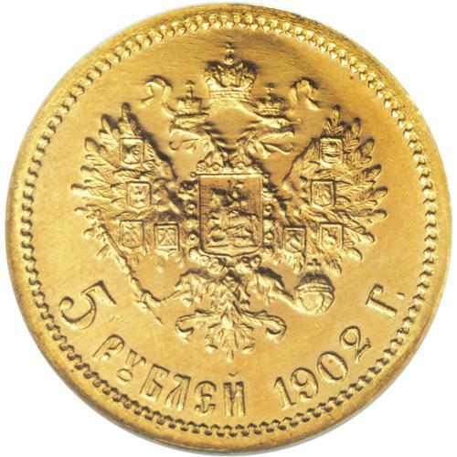 <B>Nicholas II. Proof Gold 5 Roubles 1902 AP,</B></I> Bust left/Imperial eagle with date and value, Bit-29, F-180, Proof 64 NGC. Sharply struck with orange-gold patina and frosted devices.<BR><I>From the Belle Glade Collection, Part Two.</B></I><BR><BR><b>Shipping:</b> Coins & Currency (<a target="_blank" href="http://www.heritageauctions.com/common/shipping.php">view shipping information</a>)