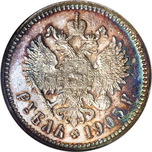 <B>Nicholas II. Proof Rouble 1905 AP,</B></I> Bust left/Crowned Imperial eagle with date and value, Bit-59 (R.1), Uzd-2148, Proof 67 Cameo NGC. Superb rose, gold, and purple toning with impeccable definition. One of the very rare issues in truly superb condition. The example in our June 2006 St. Petersburg Collection, a Gem NGC Proof 65, brought $19, 500. This infinitely nicer example in a much stronger market should bring considerably more.<BR><BR><b>Shipping:</b> Coins & Currency (<a target="_blank" href="http://www.heritageauctions.com/common/shipping.php">view shipping information</a>)