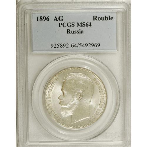 <B>Nicholas II. Rouble 1896 A?,</B></I> Bust left/Crowned Imperial eagle with date and value, Bit-39, Uzd-2066, MS64 PCGS. Full mint brilliance with a hint of golden toning.<BR><I>From the Belle Glade Collection, Part Two.</B></I><BR><BR><b>Shipping:</b> Coins & Currency (<a target="_blank" href="http://www.heritageauctions.com/common/shipping.php">view shipping information</a>)