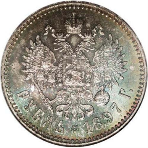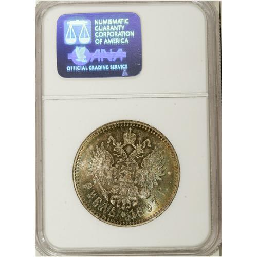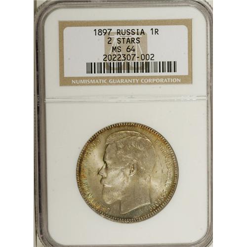 <B>Nicholas II. Rouble 1897** (Brussels) A?,</B></I> Bust left/Crowned Imperial eagle with date and value, Bit-203, Uzd-2078, MS64 NGC. Superb green and blue toning with a few light contact marks. Scarce in this condition.<BR><I>From the Belle Glade Collection, Part Two.</B></I><BR><BR><b>Shipping:</b> Coins & Currency (<a target="_blank" href="http://www.heritageauctions.com/common/shipping.php">view shipping information</a>)