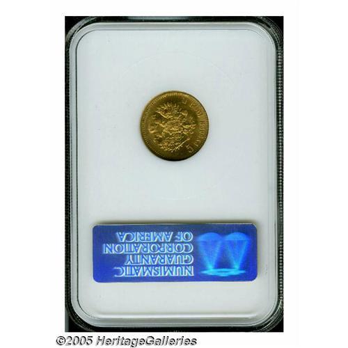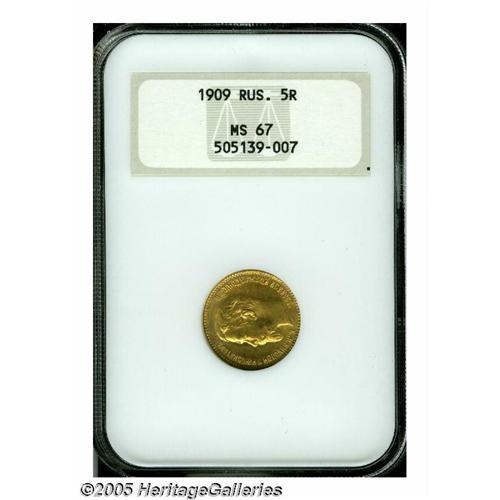 <B>Nicholas II gold 5 Roubles 1909, </B></I>KM-Y62, MS67 NGC, scarcer date and very choice.