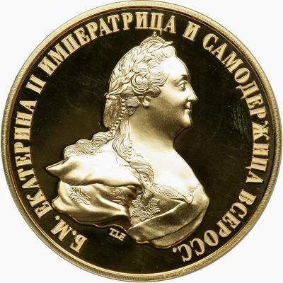 Russia. Pattern Gold 'Memorial' Rouble 1796. Catherine II (The Great), 1762-1796. Proof struck in 22ct (.916) gold. Weight 35 grams. 38.6mm diam. Edge plain. Obverse: Old coroneted portrait of Catherine facing right. Reverse: Crowned double-headed imperial eagle holding orb and sceptre, date 1796 above. One of a limited edition of 10 gold pieces recently produced by the International Numismatic Agency Ltd. Choice Brilliant Proof.