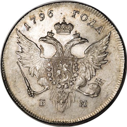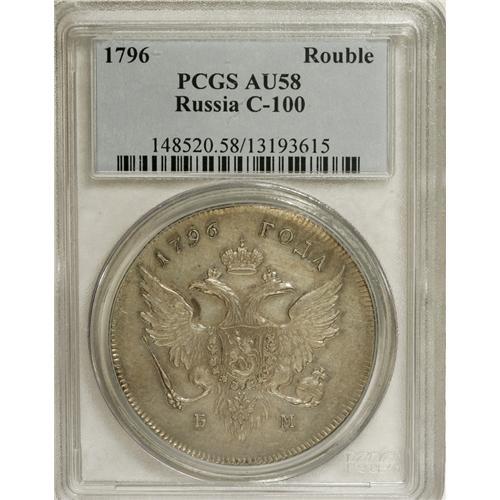 <B>Paul I. Albertus Rouble 1796 ?M,</B></I> Crowned Imperial eagle with date above. Tablet with legend, Bit-14 (R.1), Uzd-1257, AU58 PCGS. One of the classic Russian Rouble rarities, and an issue that is highly sought-after and missing from most collections. This piece has a decent strike for the issue with considerable remaining luster and a small flan flaw on the lower part of the reverse that detracts little from the overall appearance.<BR><BR><b>Shipping:</b> Coins & Currency (<a target="_blank" href="http://www.heritageauctions.com/common/shipping.php">view shipping information</a>)