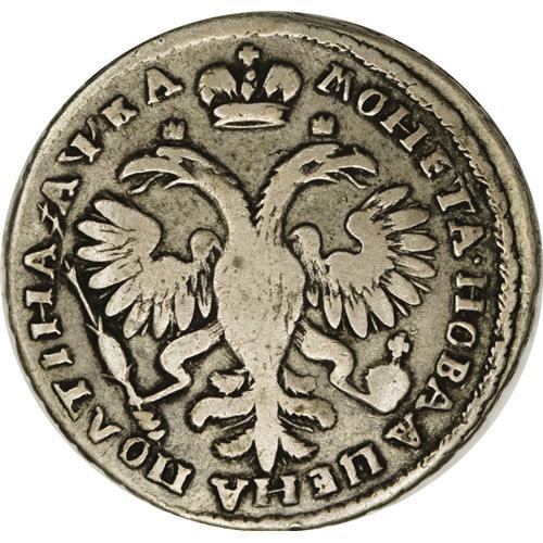 <B>Peter I. Poltina (1/2 Rouble) 1721,</B></I> Bust right/Imperial eagle, Diakov-7, Bit-676, Uzd-600, 9 feathers in eagle's wing, VF. Light gray patina with minor obverse flan flaws, but overall quite pleasing for the type.<BR><BR><b>Shipping:</b> Coins & Currency (<a target="_blank" href="http://www.heritageauctions.com/common/shipping.php">view shipping information</a>)