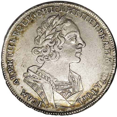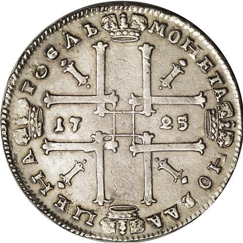 <B>Peter I. Rouble 1725,</B></I> Bust right/Four crowned, cruciform Russian P's, with the date, Diakov-50, Uzd-625, XF details with a splendid obverse, and reverse damage in the legend and crown between 9 and 10 o'clock.<BR><BR><b>Shipping:</b> Coins & Currency (<a target="_blank" href="http://www.heritageauctions.com/common/shipping.php">view shipping information</a>)