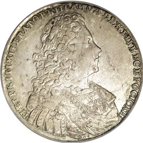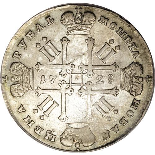 <B>Peter II. Rouble 1728, Moscow,</B></I> Laureate bust right/Four crowned, cruciform Russian P's with two I's in the angles, Bit-56, KM182.2, Dav-1668, AU53 PCGS. Original color with substantial remaining luster.<BR><BR><b>Shipping:</b> Coins & Currency (<a target="_blank" href="http://www.heritageauctions.com/common/shipping.php">view shipping information</a>)