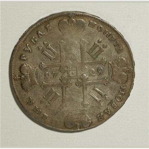 <B>Peter II. Rouble 1729, Moscow,</B></I> Laureate bust right/Four crowned, cruciform Russian P's with two I's in the angles, the date, and a dot in the center, Bit-101, KM182.3, Dav-1669, F-VF. Nice details for the grade with the normal marks that one might expect.<BR><BR><b>Shipping:</b> Coins & Currency (<a target="_blank" href="http://www.heritageauctions.com/common/shipping.php">view shipping information</a>)