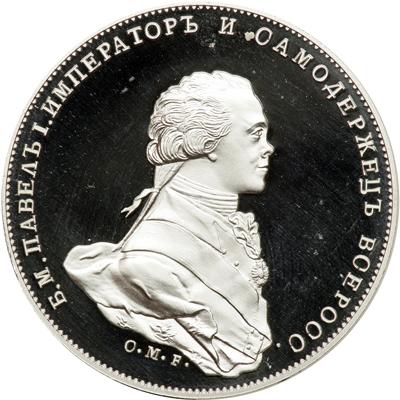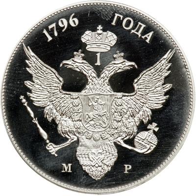 Russia. Platinum Pattern Accession Rouble 1796. Paul I,1796-1801. Proof struck in platinum. Weight 35 grams. 38.6mm diam. Edge plain. Weight 35 grams. Obverse; Draped bust of Emperor right, after C. Meisner. Reverse: Crowned imperial eagle holding orb and sceptre. M P at sides. One of a limited edition of 2 platinum pieces recently produced by the International Numismatic Agency Ltd. Choice Brilliant Proof.