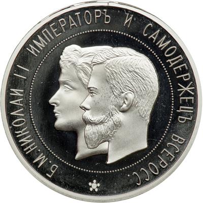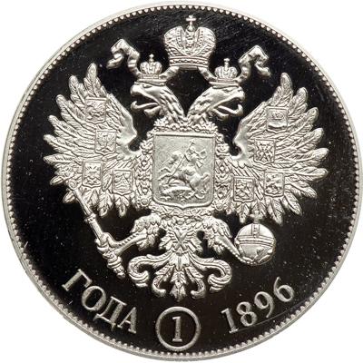 Russia. Platinum Pattern 'Accession' Rouble 1894. Nicholas II, 1894-1917. Type 2. Proof struck in platinum. Edge plain. Diam. 38.6 mm. Weight 35 grams. Obverse: The conjoined busts of Czar Nicholas II and his Empress Alexandra Fedorovna facing right, after Anton Vasyutinsky (1858-1935). Reverse: Imperial double headed Russian eagle, date (1894) and denomination 1 (Rouble) below. One of only 2 pieces recently produced struck in platinum. Choice Brilliant Proof.
