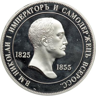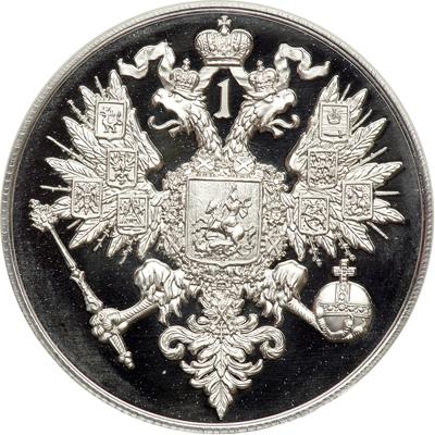 Russia. Platinum Pattern 'Memorial' Rouble 1855. Nicholas I, 1825-1855. Proof struck in platinum. Edge plain. Diameter 38.6mm. Weight 35 grams. Obverse: Older portrait of Nicholas facing right, after Utkin. Dates of reign 1825-1855. Reverse: Detailed rendition of crowned imperial two-headed eagle with orb and sceptre, numeral 1 (Rouble) above. One of only 2 pieces recently produced struck in platinum. Choice Brilliant Proof.