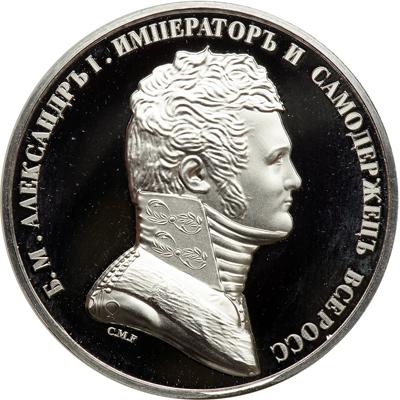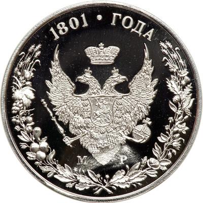 Russia. Platinum Pattern 'Military' Rouble 1801. Alexander I, 1801-1825. Edge plain. Diam. 38.6 mm. Weight 35 grams. Proof struck in platinum. Obverse: Czar facing right with military uniform. Reverse: Crowned imperial double headed eagle with uplifted wings, within detailed wreath of fruit, leaves, wheat etc. Initials M and P to left and right of eagle. One of only 2 pieces recently produced struck in platinum. Choice Brilliant Proof.