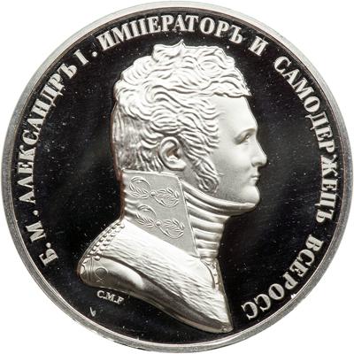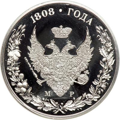 Russia. Platinum Pattern 'Military' Rouble, 1808. Alexander I, 1801-1825. Proof struck in platinum. Edge plain. Diam. 38.6 mm. Weight 35 grams. Obverse: Czar facing right with military uniform. Reverse: Crowned imperial double headed eagle with uplifted wings within detailed wreath of fruit, leaves, wheat etc. Initials M and P to left and right of eagle. One of only 2 pieces recently produced struck in platinum. Choice Brilliant Proof.