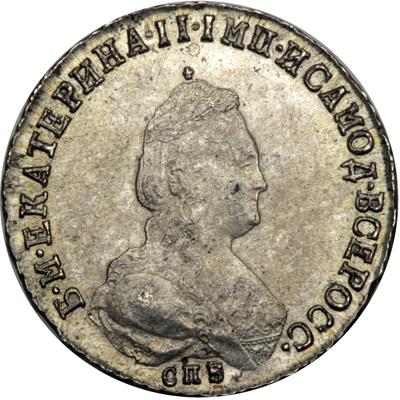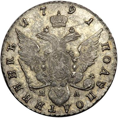 Russia. Polupoltinnik (¼ Ruble), 1791-SPB YaA. Bitkin-1st ed-338; KM-C65c; Sev-2283. Catherine II, The Great, 1762-1796. Traces of mint luster with light gray toning. NGC graded AU-58.