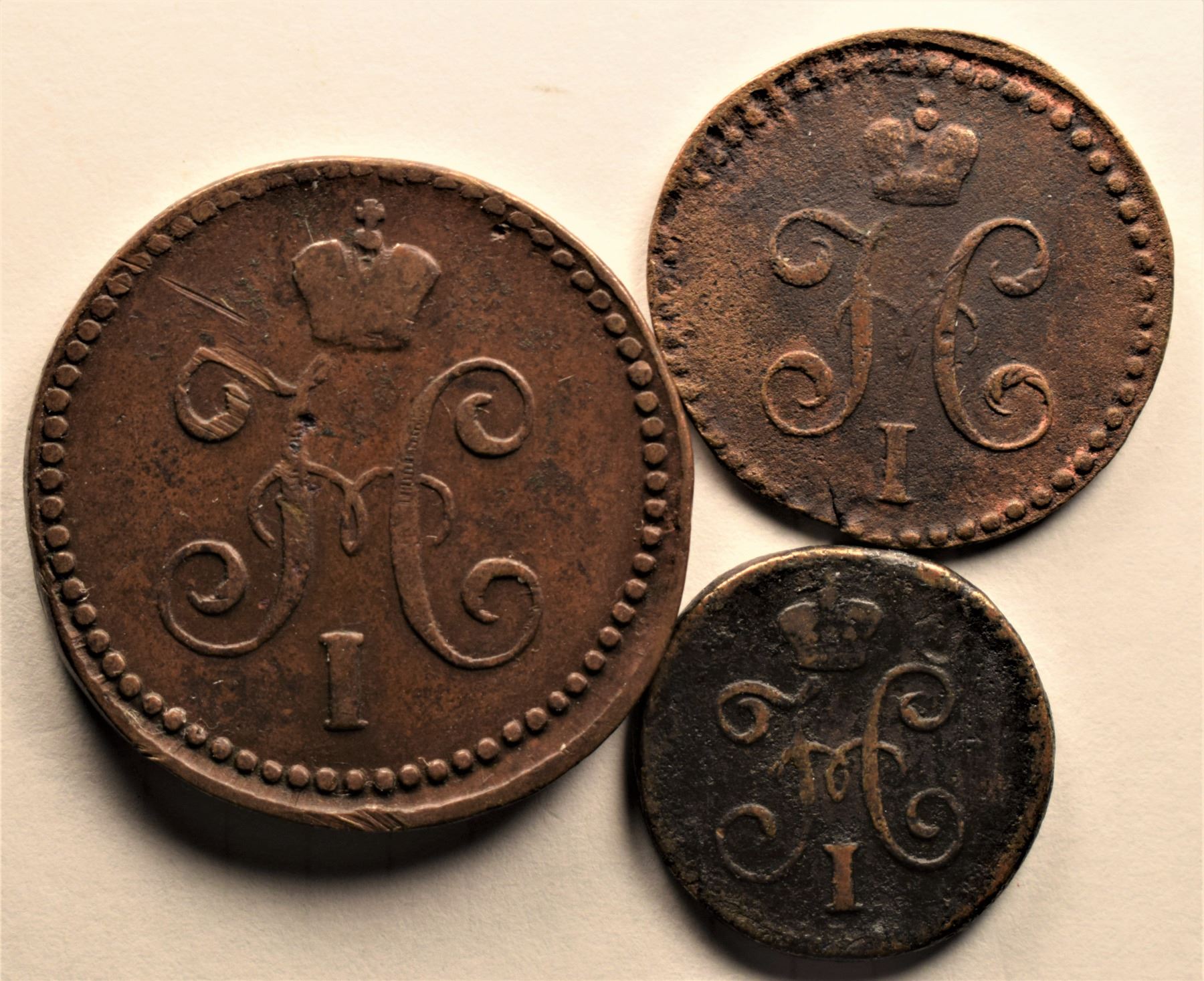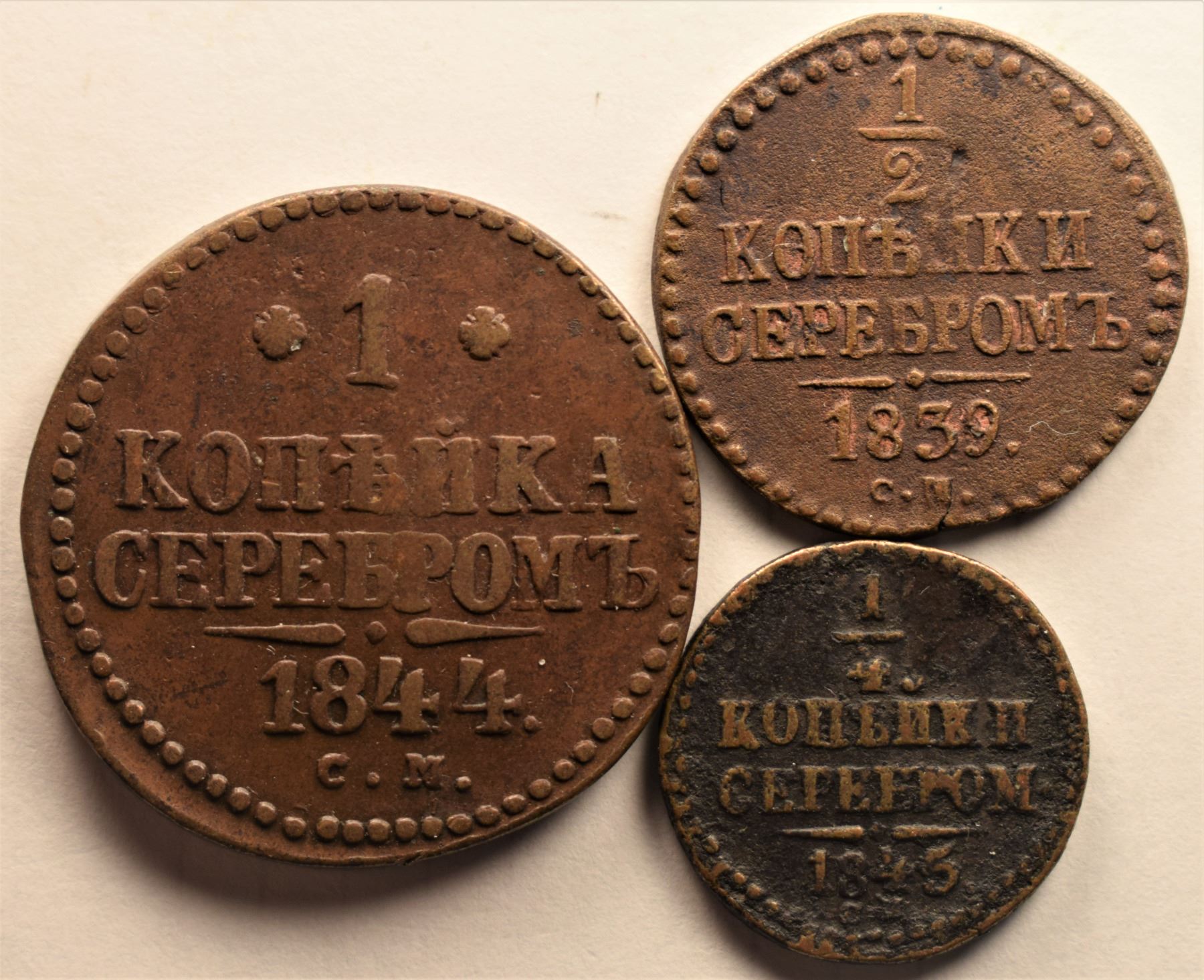 Russia, Polushka (¼ Kopek) 1845CM, ½ Kopek 1939CM (Key Date) and 1 Kopek 1844CM All Cooper Grades Choice F to VF+ (3)