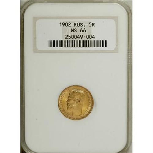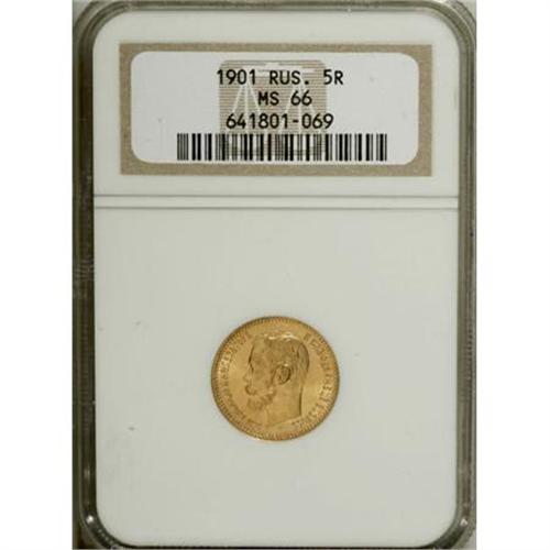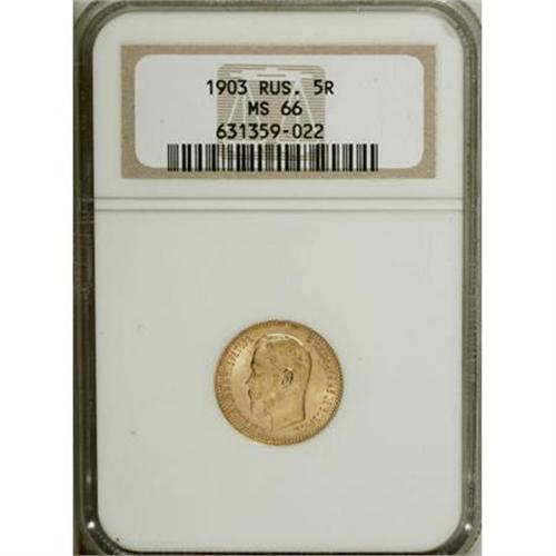 <B>A trio of Nicholas II gold 5 Roubles including</B></I>: 1901, MS66 NGC; 1902 MS66 NGC, and 1903 MS66 NGC. <BR><BR><b>Shipping:</b> Coins & Currency (<a target="_blank" href="http://www.heritageauctions.com/common/shipping.php">view shipping information</a>)