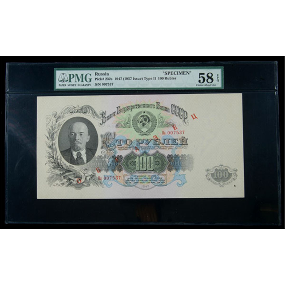 Russia SCWPM# 232s, 1947 (1957) 100 Rubles Specimen. PMG Choice About Unc 58 EPQ. . Fr-P-232s. This Lenin-portrait note is unlisted as a specimen in the Krause reference. A single corner fold defines the grade.