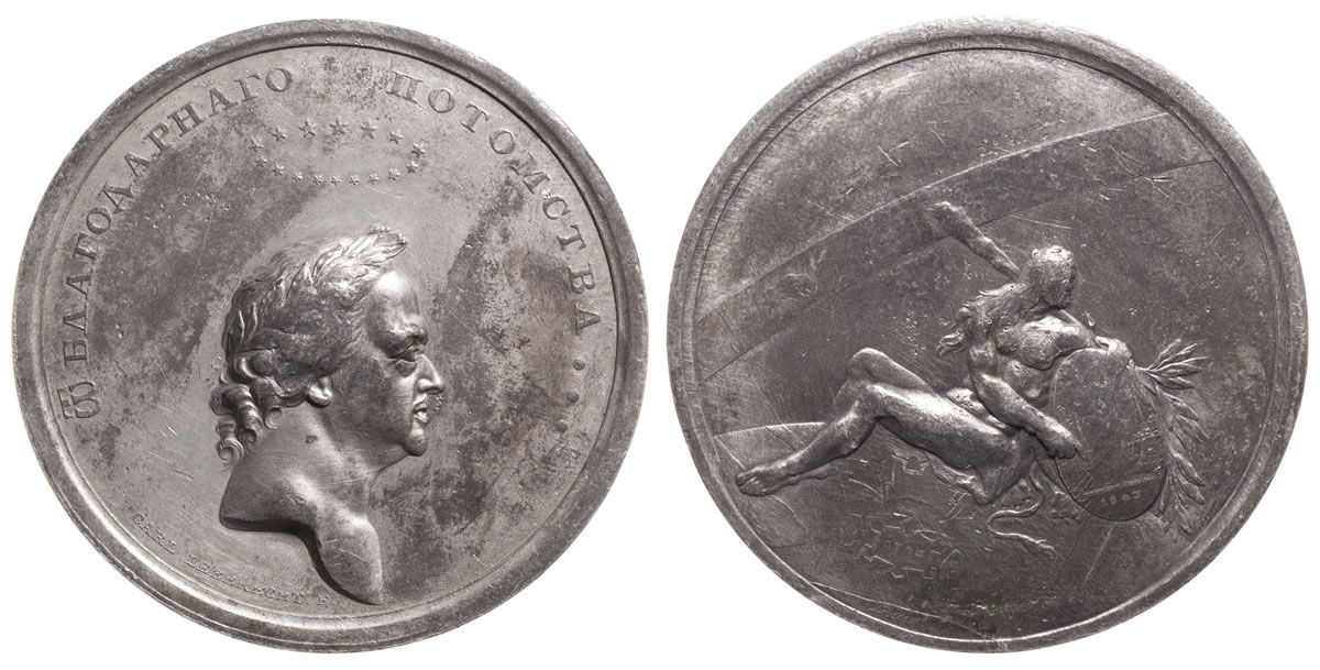 Empress Elizabeth, 1754, white metal 65mm medal in praise of the Empress' support of the serbs in their struggle agains the Ottoman Turks. NOVA SERBIA, Minerva with Serbian coat-of-arms (Diakov 2, 68/98). Details Extremely Fine, some light abrasion to hig