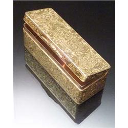 Russian 14-Karat Yellow Gold Floral and Trellising Vine Decorated Trinket Box Early 20th Century The underside of the hinged lid inscribed Teresa. Length: 3-1/2 in (8.9 cm) Width: 1-1/4 in (3.2 cm) Depth: 1-1/4 in (3.2 cm) Weight: 66.5 dwt $1,000 - $1,500