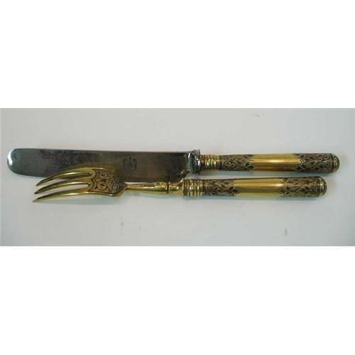 </font></strong>Russian 19th c. silver gilded and niello traveling set of spoon and fork. Moscow, 1891 Vasiliy Semenov