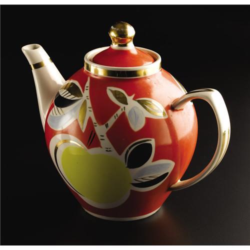 <B>A Russian Art Deco Style Tea Pot</B></I><BR><BR>Poskotchin, Russia<BR>Circa 1920-1930<BR>Porcelain<BR>Marks: blue printed mark<BR>8.5 inches high<BR><BR>The globular form with everted spout decorated with a lemon on a branch reserved on a bright orange ground, embellished with gilt.<BR> <B>Condition Report:</B> Wear to gilding, especially on finial.<BR><BR><b>Shipping:</b> Requires 3rd Party Shipping (<a target="_blank" href="http://www.heritageauctions.com/common/shipping.php">view shipping information</a>)