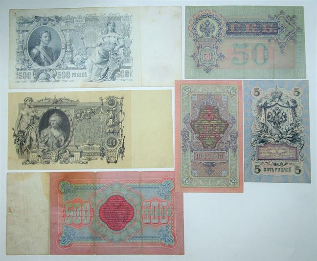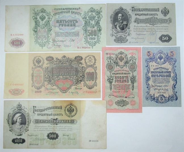 Russia.., 1898 (1909-12)- ND (1917- Old Date 1909). Lot of 6 Issued Banknotes, Includes: State Credit Notes 500 Rubles, P-6c, 1898 (1909-12); 50 Rubles, P-8d, 1899 (1912-17); 10 Rubles, P-11a, 1909 (1903-09); 100 Rubles, P-13a, 1910 (1909-12); 500 Rubles, P-14b, 1912 (1912-17); Government Credit Note 5 Rubles, P-35, ND (1917- Old Date 1909). Notes range from VF-XF condition. (6). Sold "AS IS" no returns accepted.