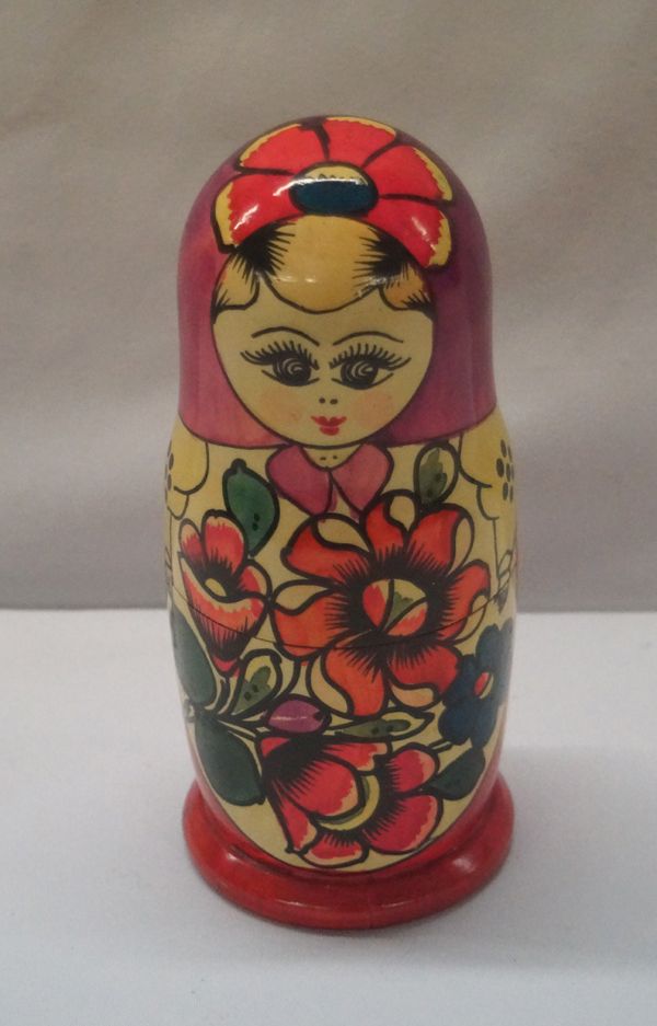Russian ''Babushka'' Nesting Dolls, measures 7.75''H x 3.25''D, vibrantly painted, set includes 5 dolls, A matryoshka doll, also known as Russian nesting doll or babushka doll, refers to a set of wooden dolls of decreasing size placed one inside the other. The first Russian nested doll set was carved in 1890 by Vasily Zvyozdochkin. Traditionally the outer layer is a woman, dressed in a sarafan, a long and shapeless traditional Russian peasant jumper dress. The figures inside may be of either gender; the smallest, innermost doll is typically a baby turned from a single piece of wood.