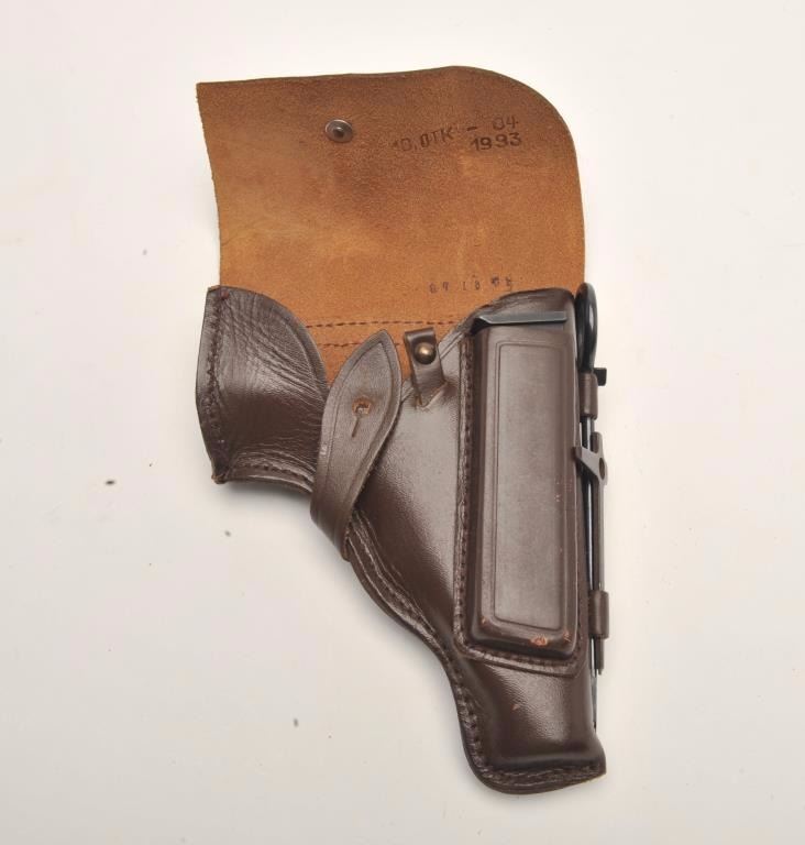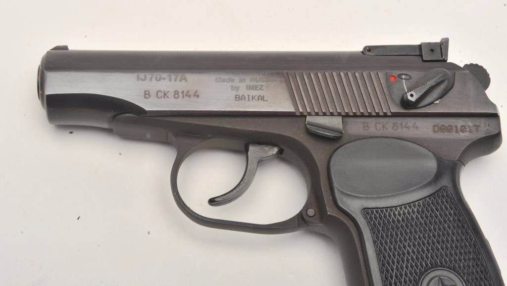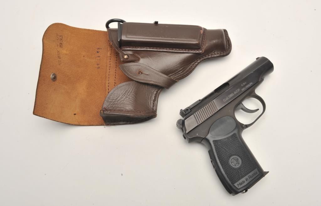 Russian Baikal DA semi-automatic pistol by IMEZ, import-marked, .380 ACP caliber, 3.5” barrel, blued finish, checkered grips, S/N D001017, in overall fine condition showing little use; with leather flap holster and one extra magazine. (Modern/No PPT). Est.: $125-$250.