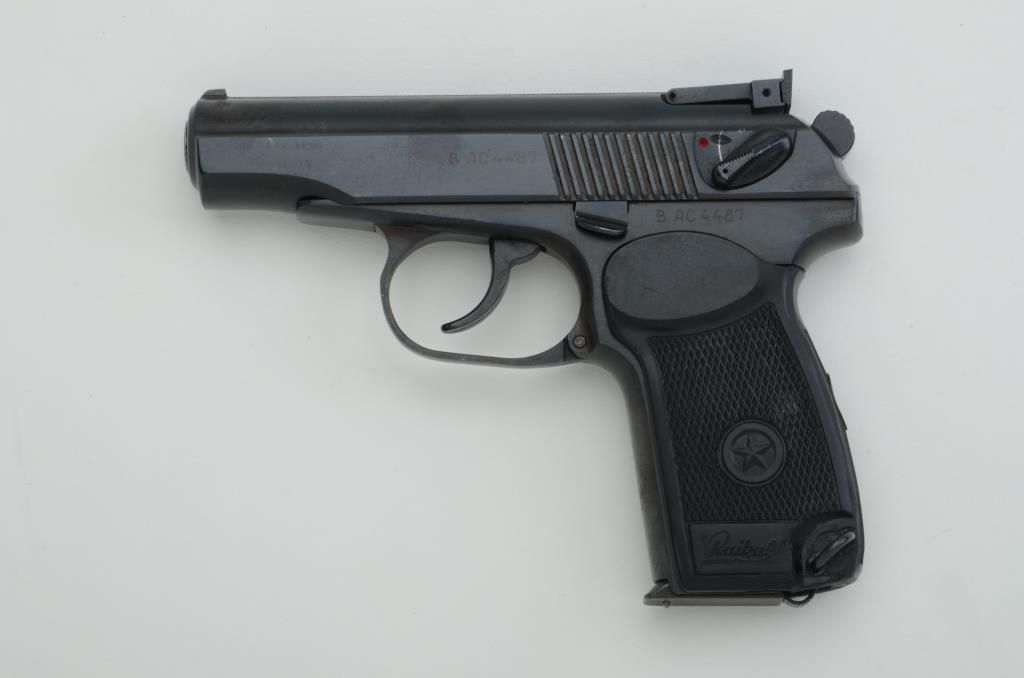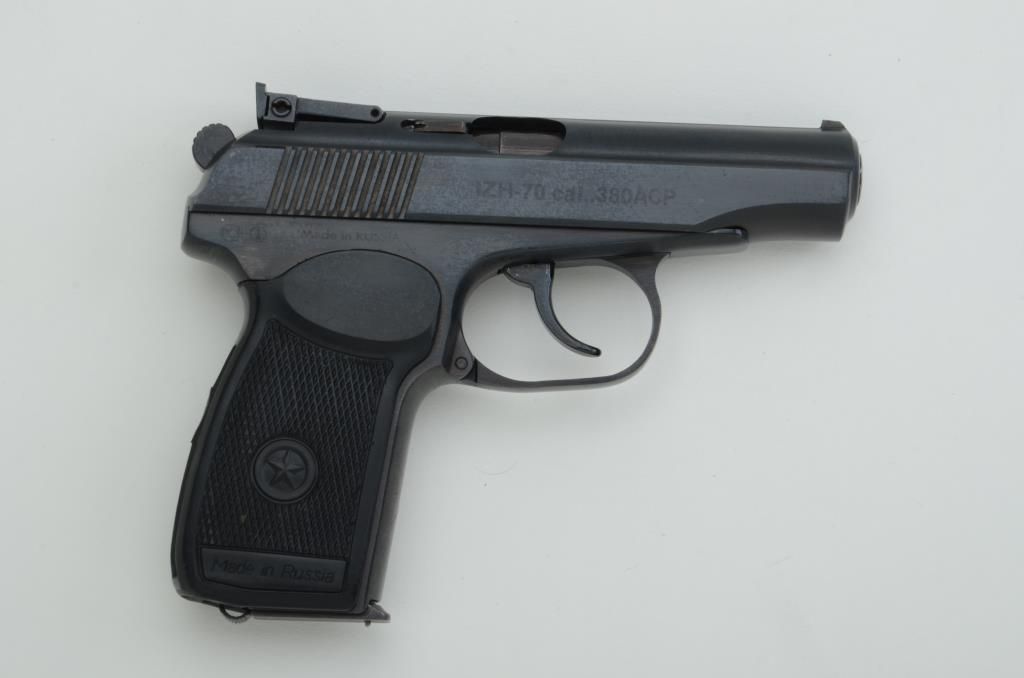 Russian Baikal Model IZH-70 DA semi-auto pistol, .380 cal., 3-3/4” barrel, blue finish, checkered hard rubber grips, #B AC4487 with extra magazine. This gun is in overall excellent condition showing littleuse or handling. Est.: $100-$200.