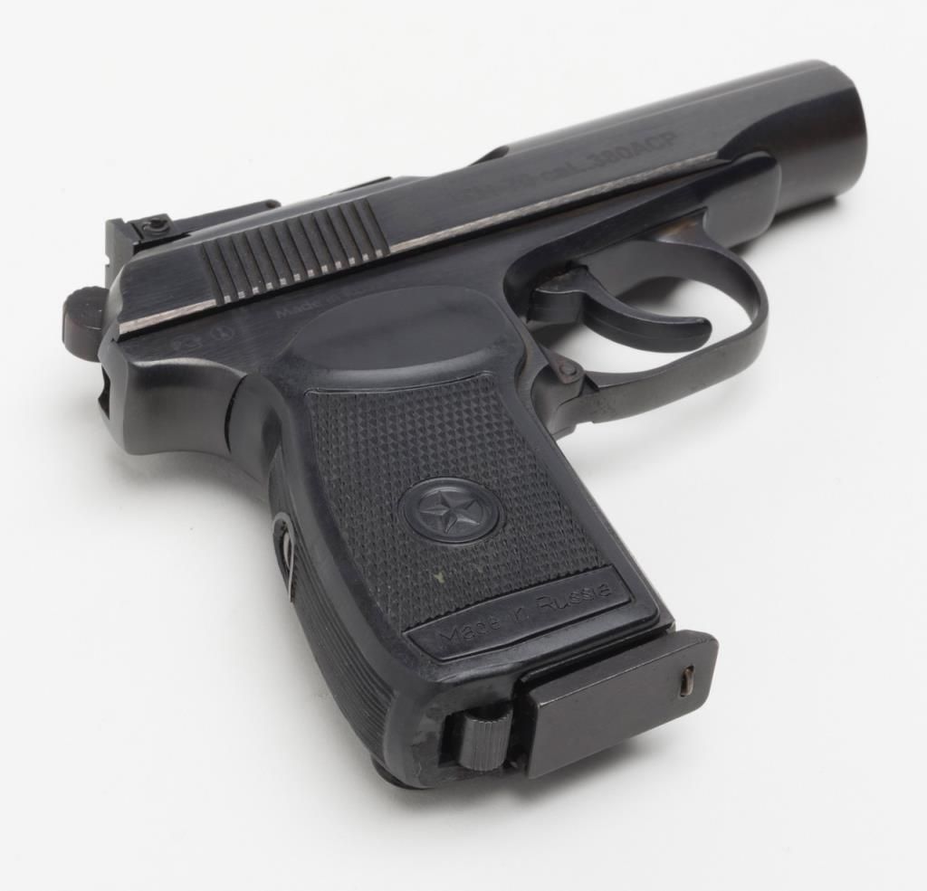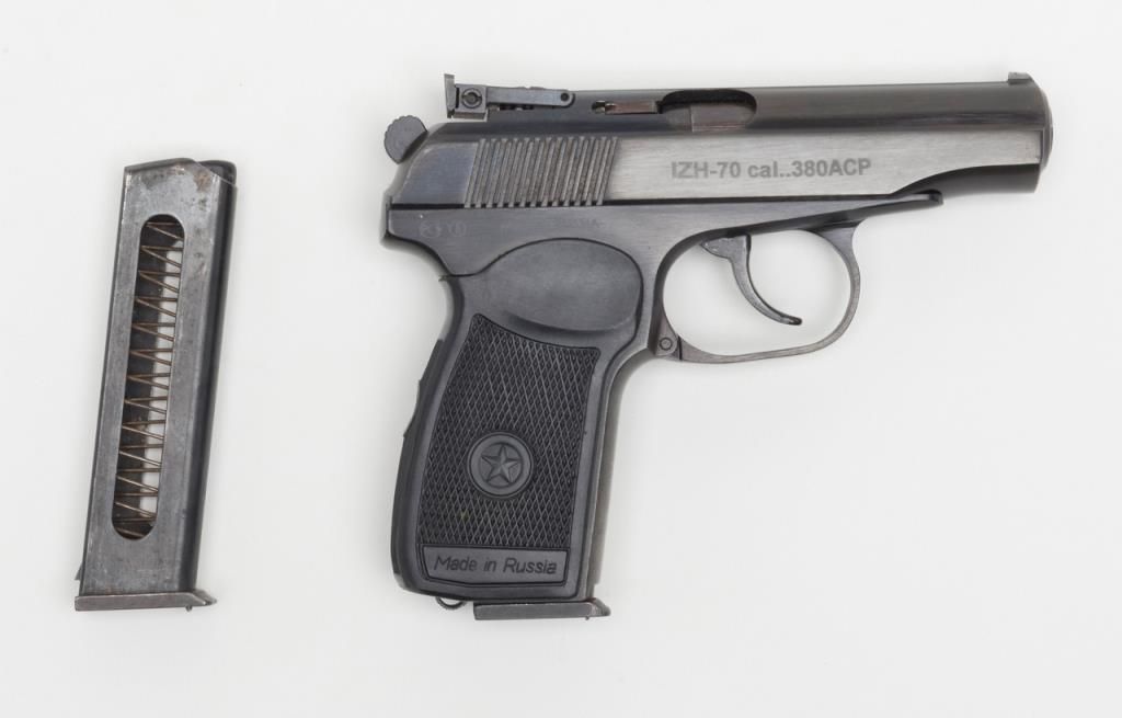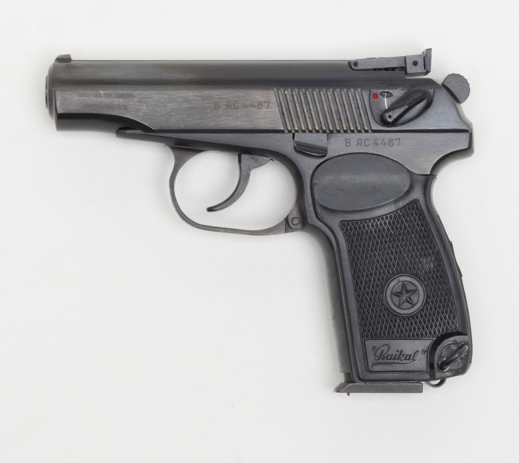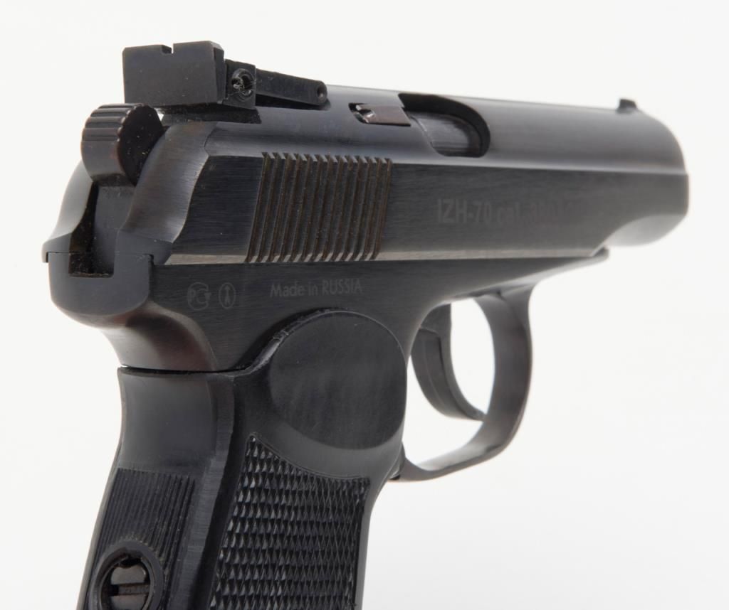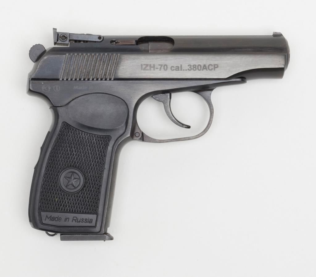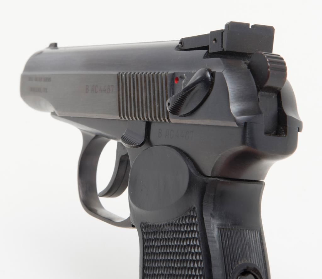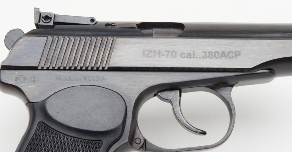 Russian Baikal Model IZH-70 DA semi-auto pistol, .380 cal., 3-3/4” barrel, blue finish, checkered hard rubber grips, #B AC4487 with extra magazine. This gun is in overall excellent condition showing little use or handling. (Modern/No Calif.Sale). Est.: $100-$200.