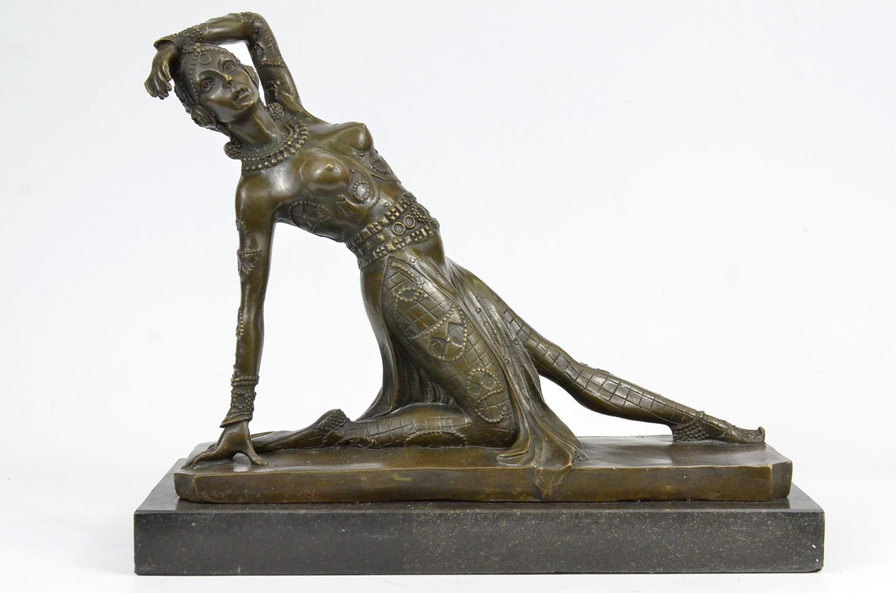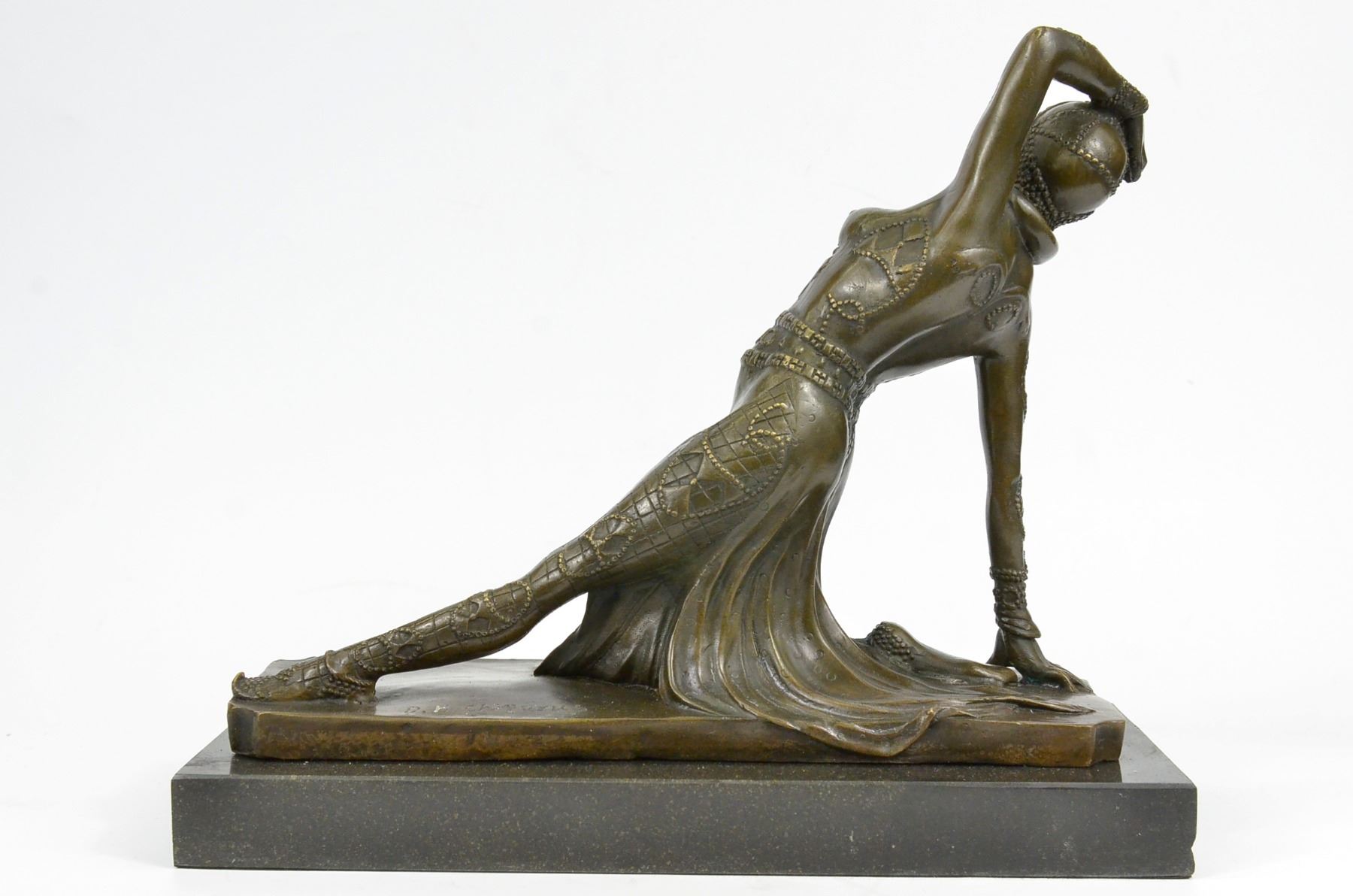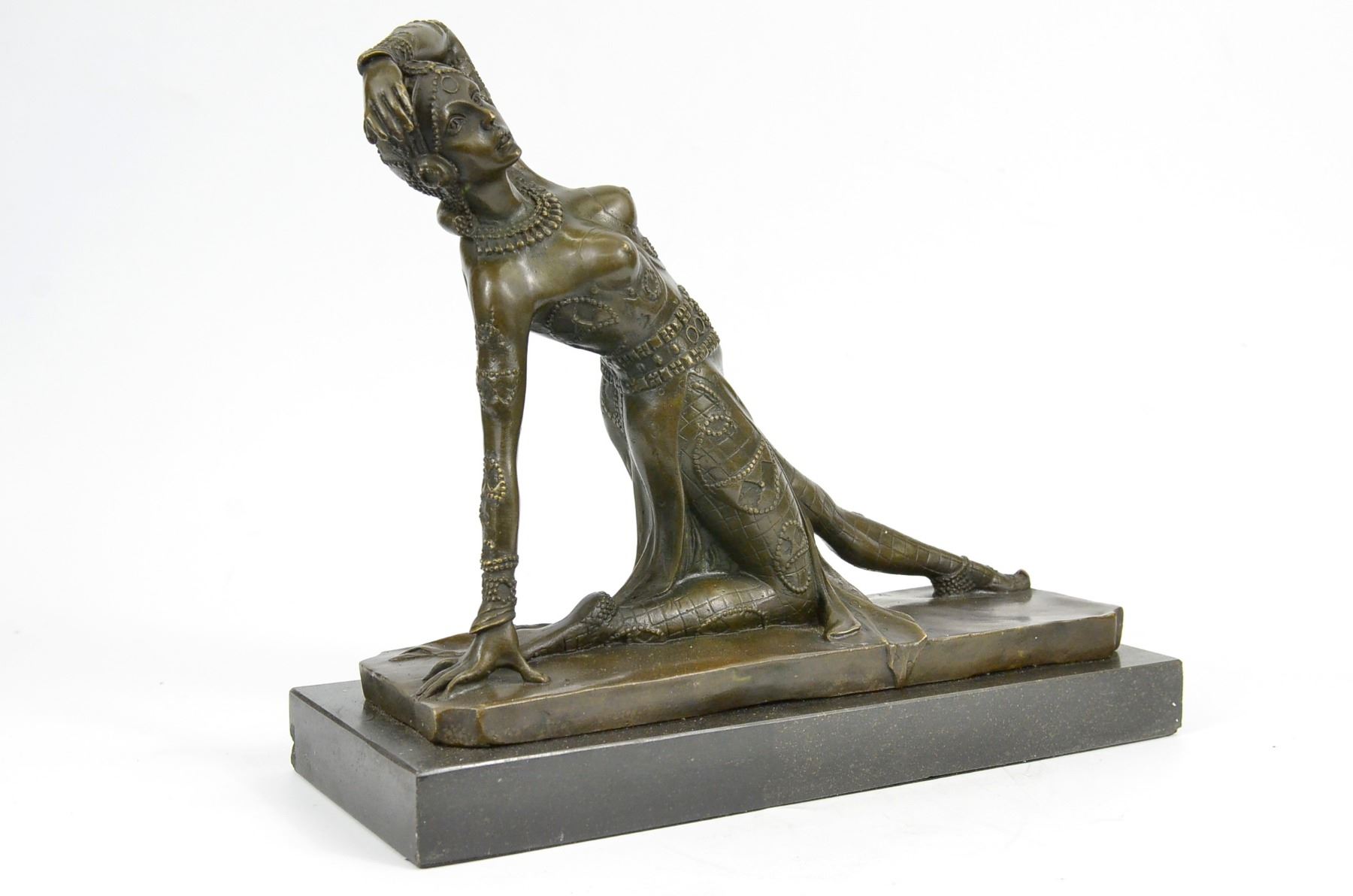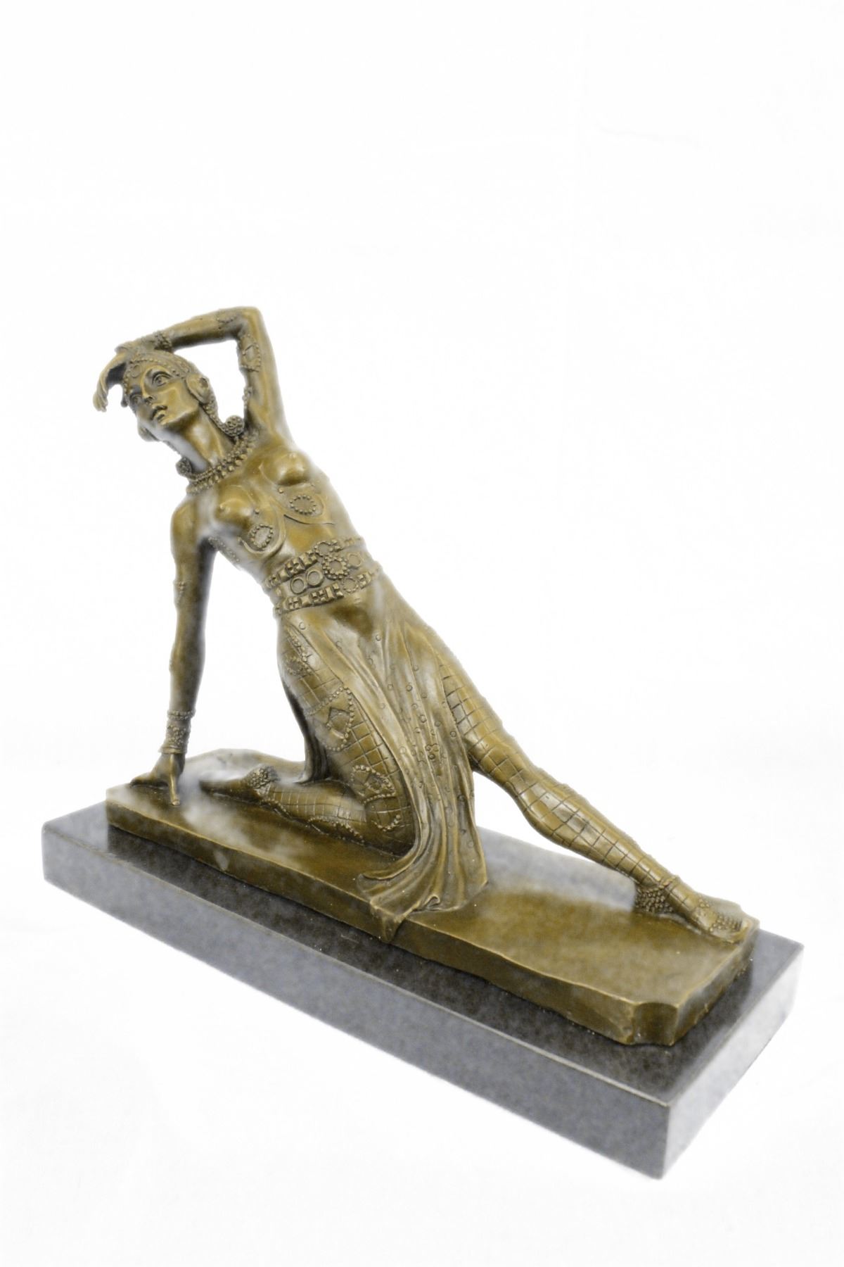 Drawing From The Russian Ballet And French Culture Chiparus De This Festive Dancer. The Dancer Is Dressed Head To Toe In An Intricately De Costume. She Is Kneeling On The Ground With A Lean Leg Stretched In Front Of Her, An Arm Bent Over Head And The Other On The Floor To Support Her. SheS A Confident Performer, Sure Of Her Beauty. Grace And Skill While Posing. This Sculpture Is Set On A Black Marble Base. The Piece Was Sculpted Using The Laborious And Popular Lost Wax Method. Bronze dimensions with marble base: Height 11 X Width 12 inches. Weight: 12 lbs.Please Note: This is a reproduction bronze sculpture from the original molded and signed. This featured bronze sculpture is a recast after the original, and has been done recently. This 100% bronze sculpture is an abstract piece certain to be a conversation piece.Please Note: This is a reproduction bronze sculpture from the original molded and signed. This featured bronze sculpture is a recast after the original, and has been done recently. This 100% bronze sculpture is an abstract piece certain to be a conversation piece.