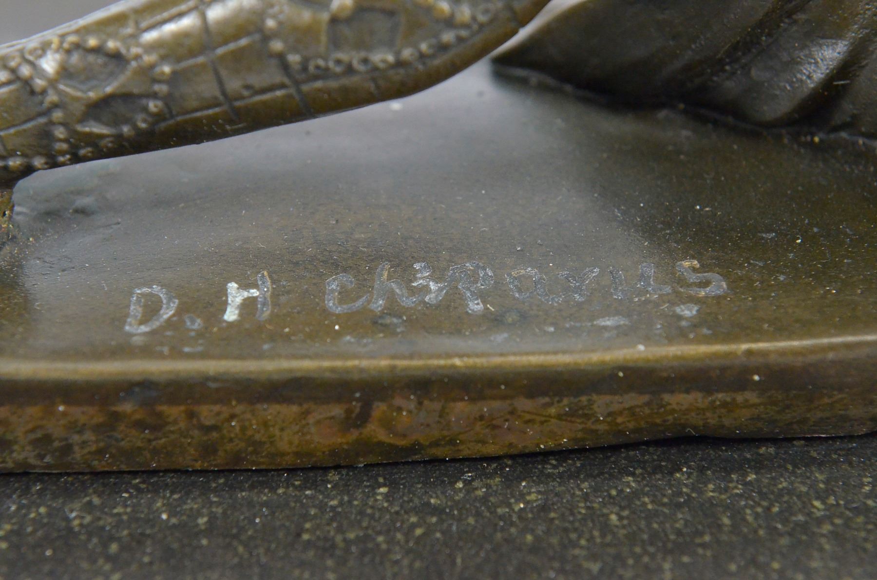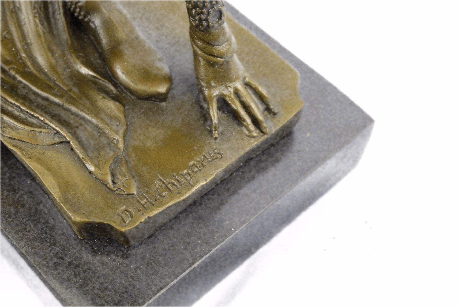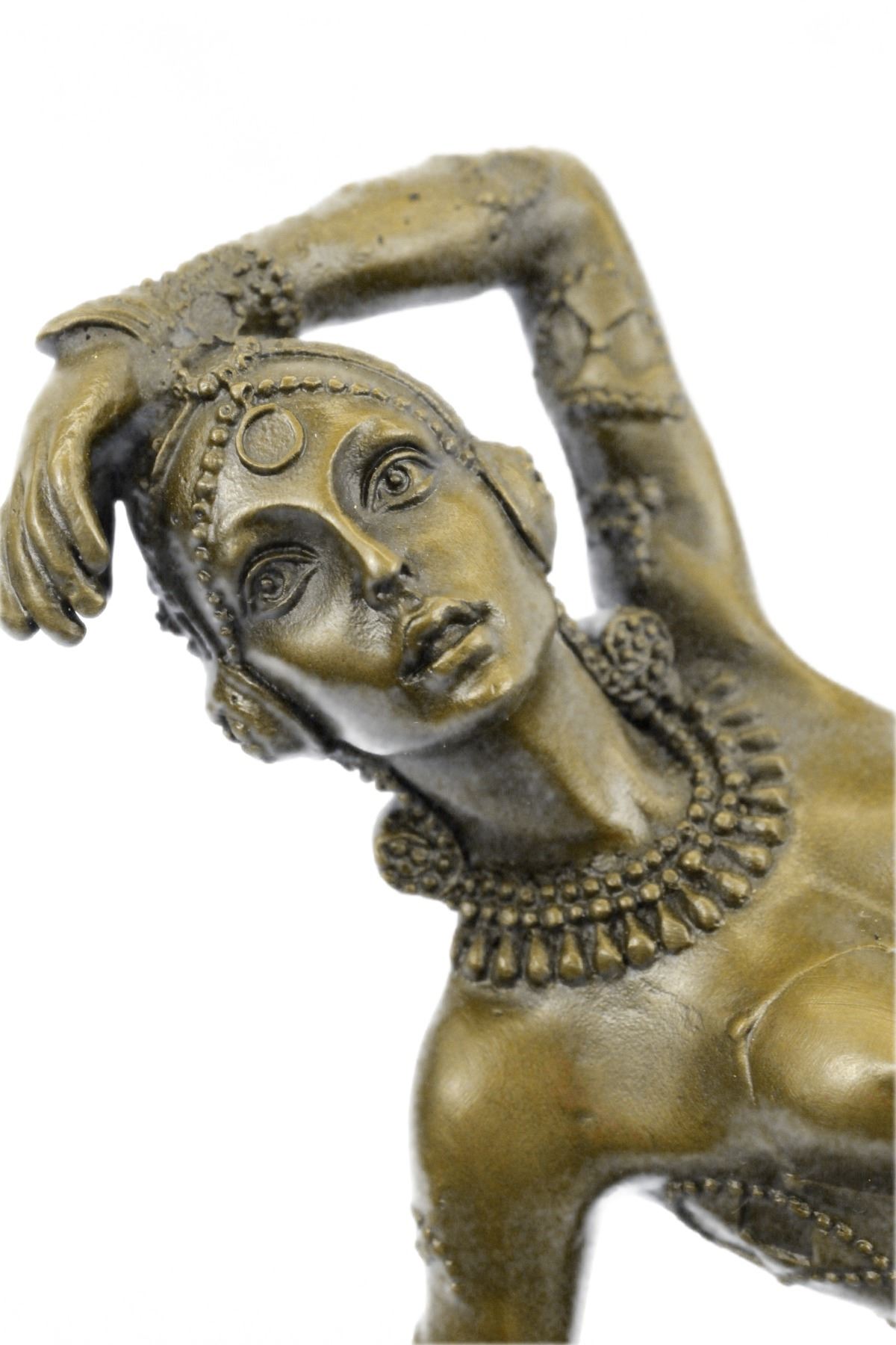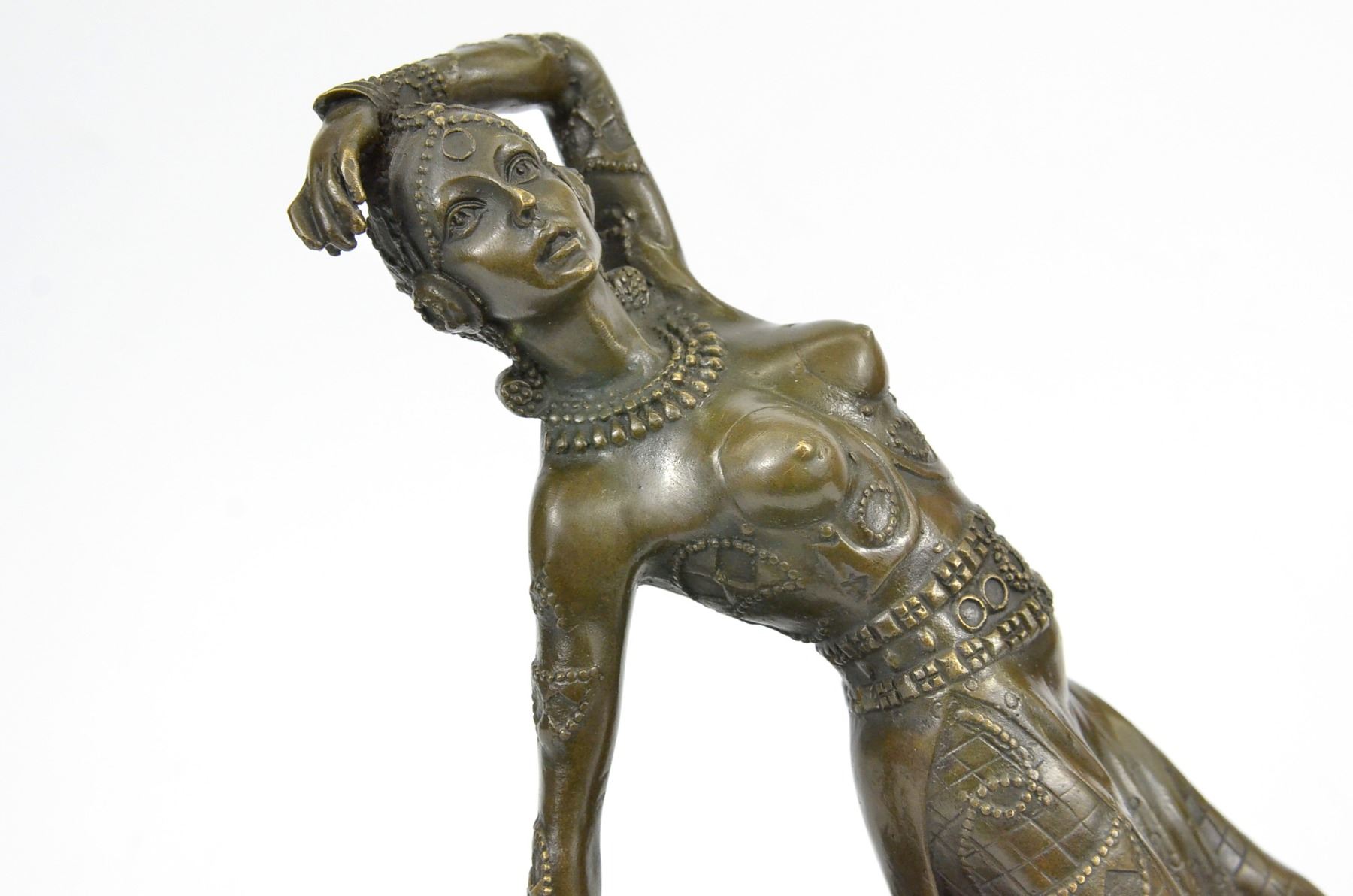 Drawing From The Russian Ballet And French Culture Chiparus De This Festive Dancer. The Dancer Is Dressed Head To Toe In An Intricately De Costume. She Is Kneeling On The Ground With A Lean Leg Stretched In Front Of Her, An Arm Bent Over Head And The Other On The Floor To Support Her. SheS A Confident Performer, Sure Of Her Beauty. Grace And Skill While Posing. This Sculpture Is Set On A Black Marble Base. The Piece Was Sculpted Using The Laborious And Popular Lost Wax Method. Bronze dimensions with marble base: Height 11 X Width 12 inches. Weight: 12 lbs.Please Note: This is a reproduction bronze sculpture from the original molded and signed. This featured bronze sculpture is a recast after the original, and has been done recently. This 100% bronze sculpture is an abstract piece certain to be a conversation piece.Please Note: This is a reproduction bronze sculpture from the original molded and signed. This featured bronze sculpture is a recast after the original, and has been done recently. This 100% bronze sculpture is an abstract piece certain to be a conversation piece.