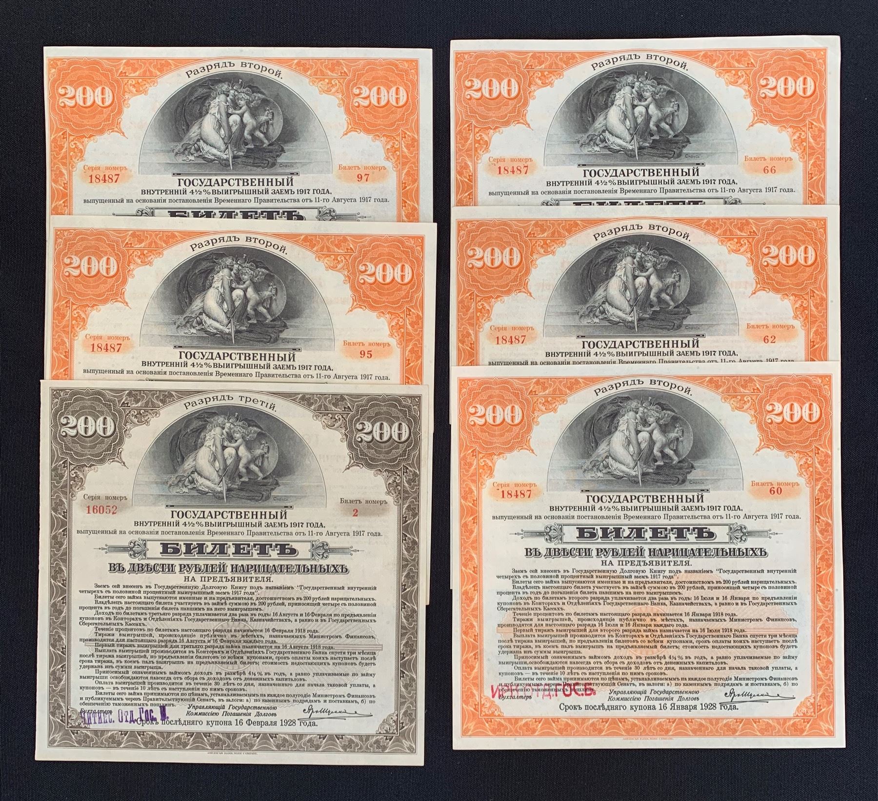 printed by ABNCo. Vignette at upper centre is the Security Allegory seen on the backs of Bank of Canada $1,000 notes of 1935 and 1937. AU, minor corner folds x2; UNC x4; All colourful and pretty. 6 pieces.