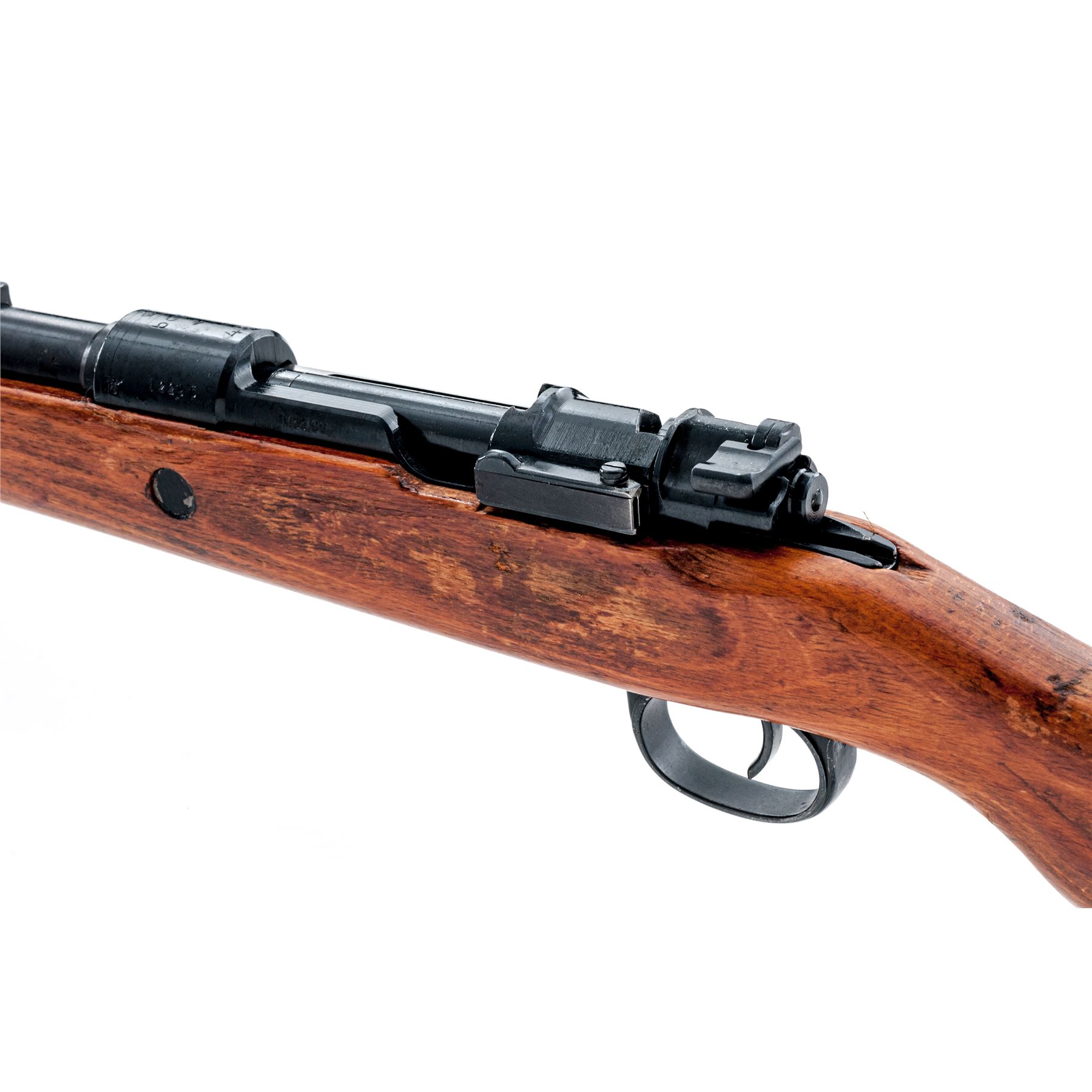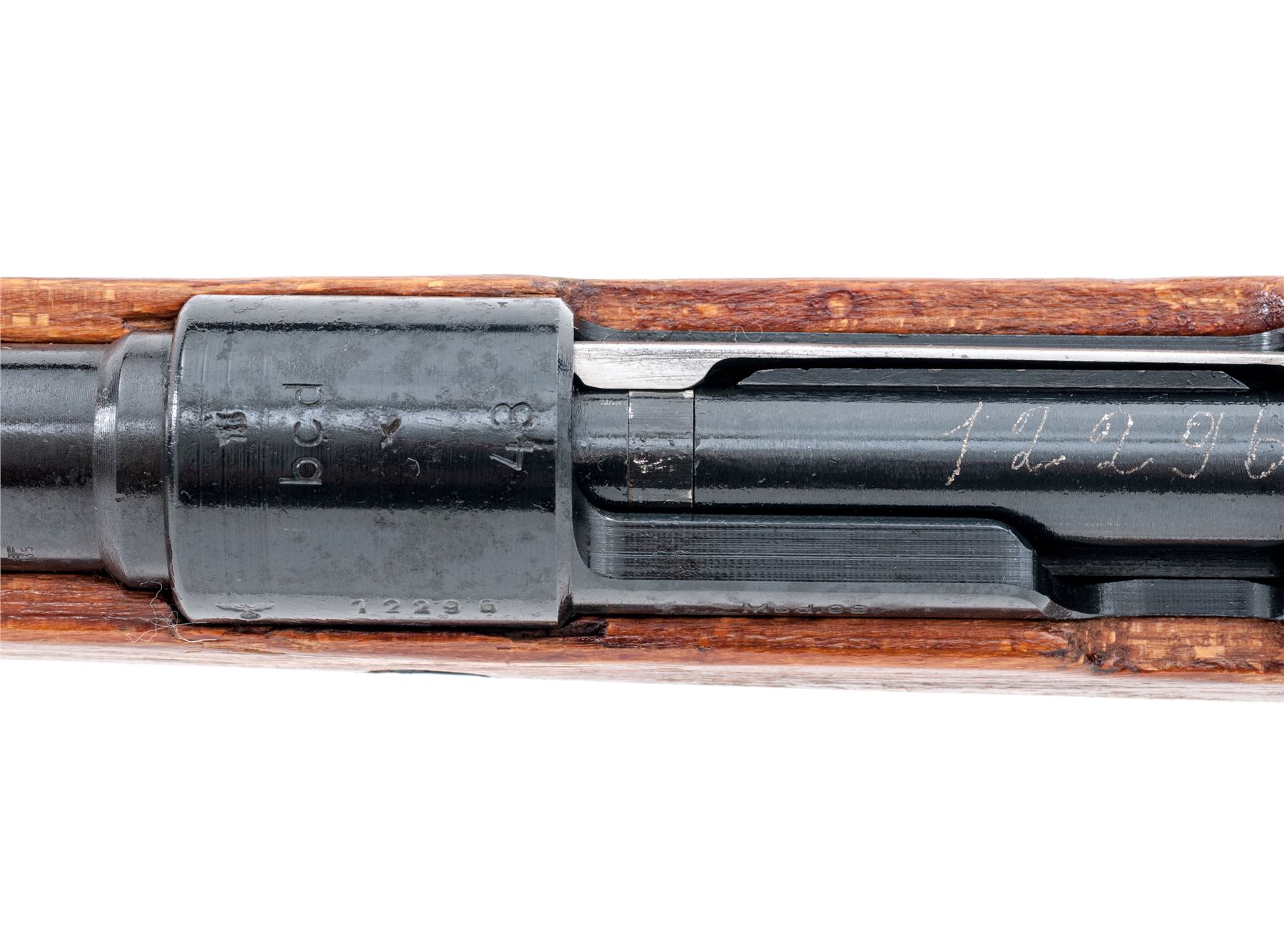 Russian Capture German Kar98k Mauser Bolt Action Rifle, #12296, 8x57mm cal., 23.6'' barrel, black finish, laminated stock with cup buttplate, inverted ''V'' front sight and adjustable tangent rear sight. Marked on top of receiver ring ''bcd/43''; ''Mod.98'' on left side receiver rail. Eagle proofs intact on left side receiver and barrel. Soviet ''X'' stamped on top of receiver. No bayonet lug. Matching re-numbered serial number electric pencil engraved on bolt and triggerguard and stamped on left side of buttstock. Condition overall is very good with over 95% of the black arsenal refinish remaining on the metal. Wood is very good but shows considerable flaking and some scratches to the Soviet applied shellac finish. Action is smooth, bright bore is near excellent. Import stamped on right side of barrel. Est.: $500-$700. (C&R)