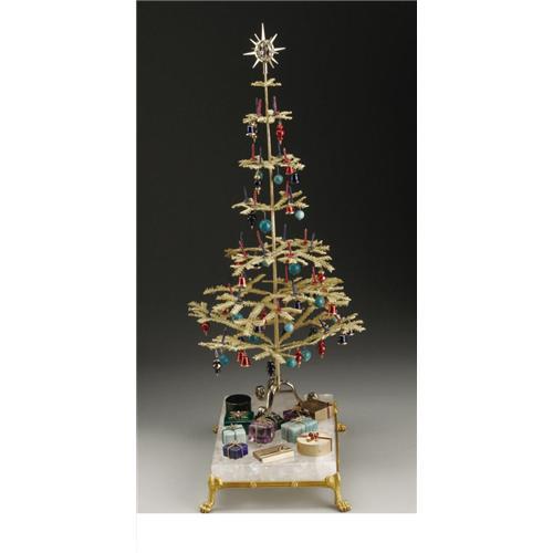 <B>Russian Christmas Tree Ensemble</B></I><BR><BR>Russia<BR>Early Twentieth Century<BR>Gilt bronze, rock crystal and hardstones<BR>13.37 in. high (tree and star only)<BR><BR>The gilt bronze Christmas tree adorned with enameled and hardstone ornaments, surmounted by a star finial with diamonds, all above assorted hardstone packages, set on a rock crystal plinth with gilt bronze claw feet (Total: 14 items).<BR><BR>Provenance:<BR>Walsh Family Art Trust14 Items <BR><BR><B>Condition Report:</B> Normal signs of wear as appropriate with age, repair and wear