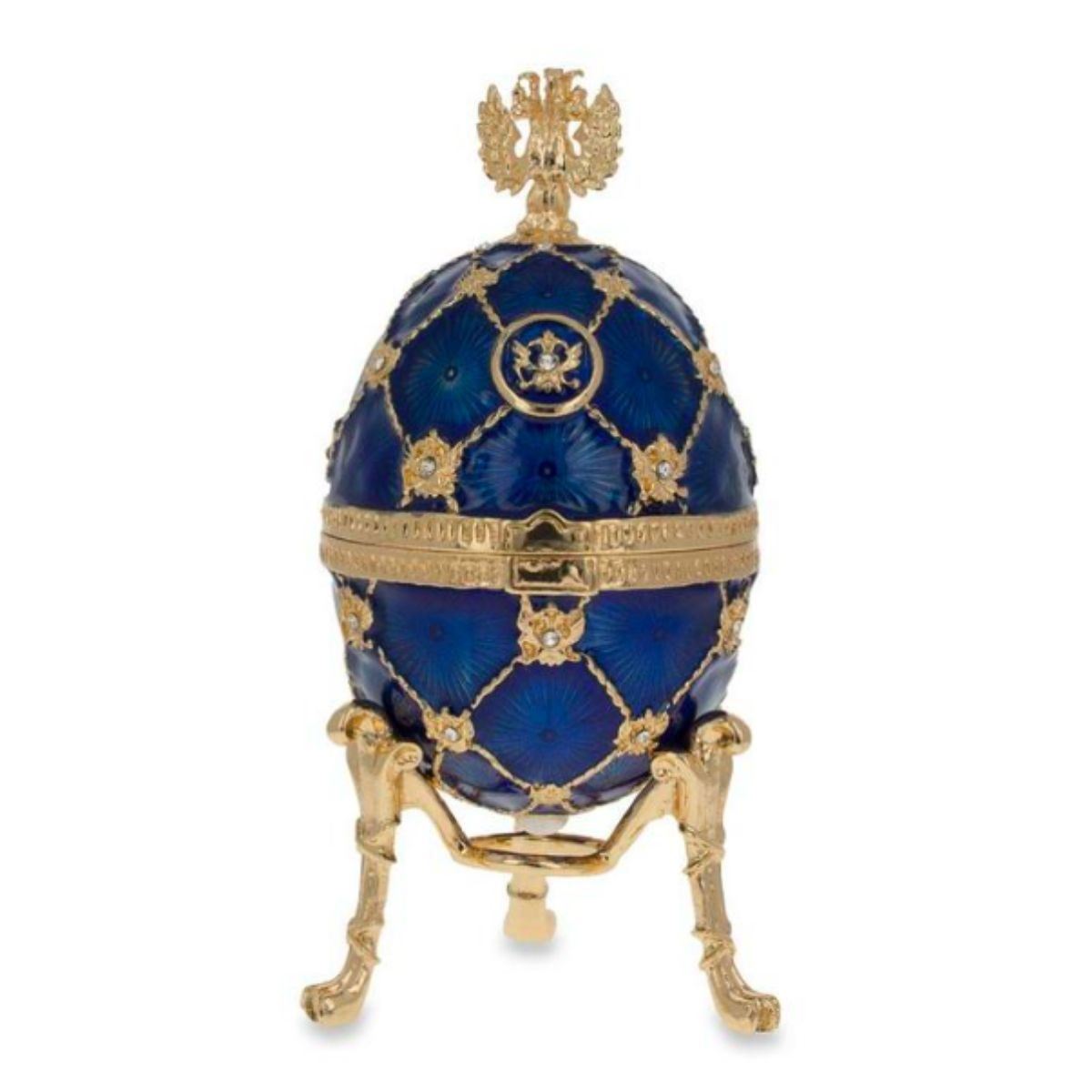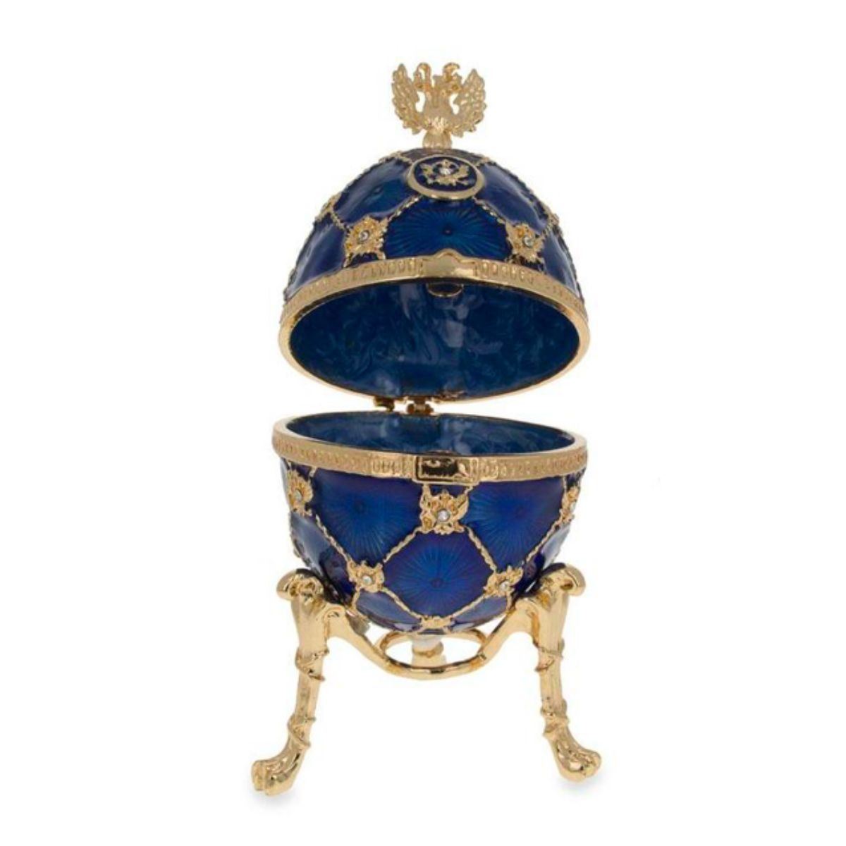 Inspired by the original designs of Carl Faberge for the Russian Royal Family, enamel & gilt over pewter with embedded Austrian crystals. The egg opens at center, with magnetic closure, to reveal an enameled interior for storing trinkets or jewels. The egg lifts off its gilt stand. 5: H X 2" D.Â