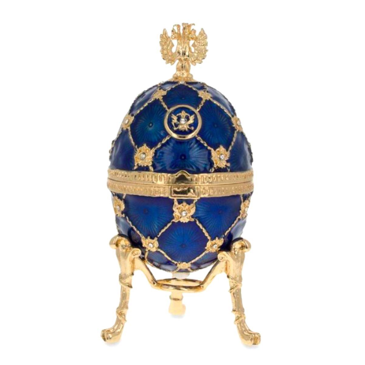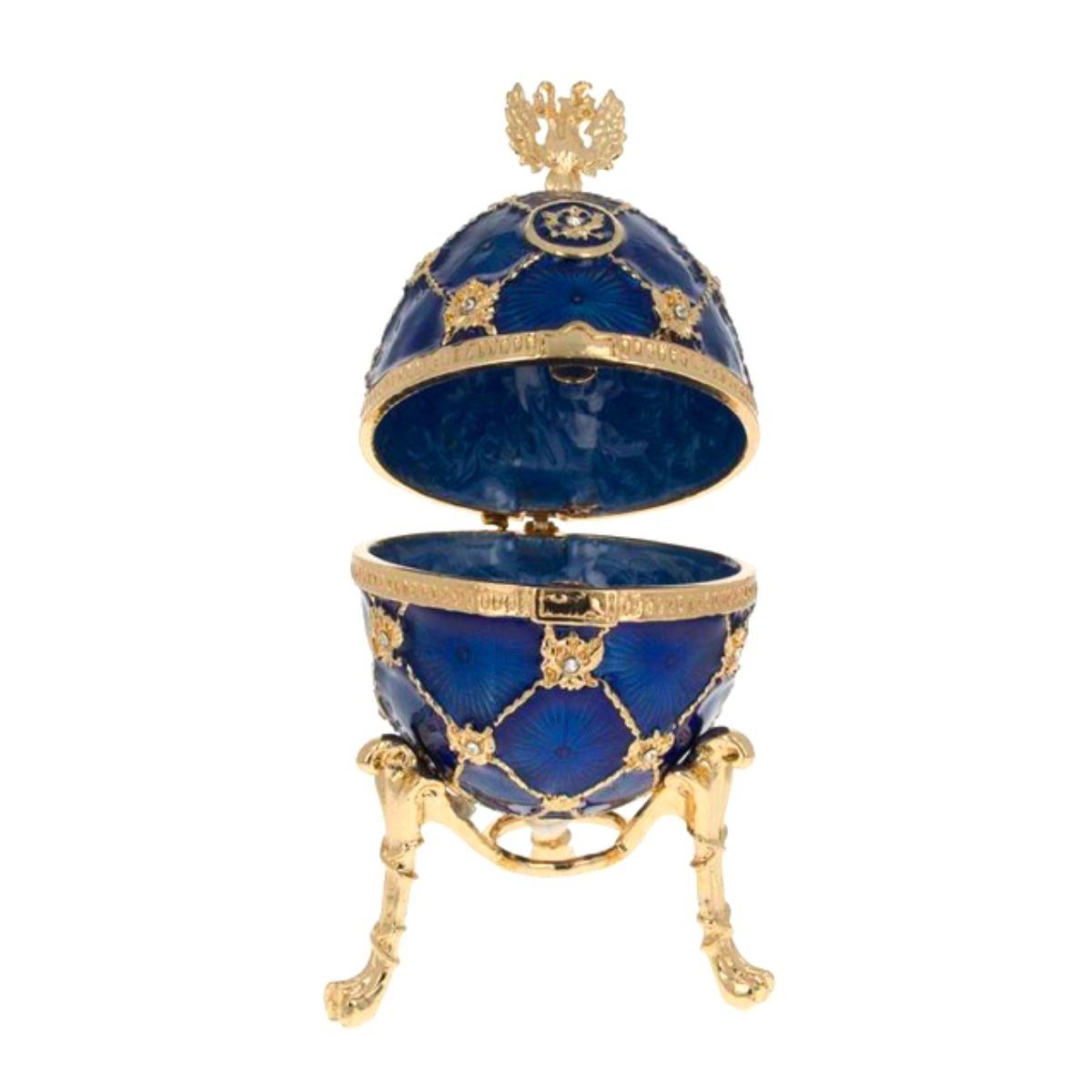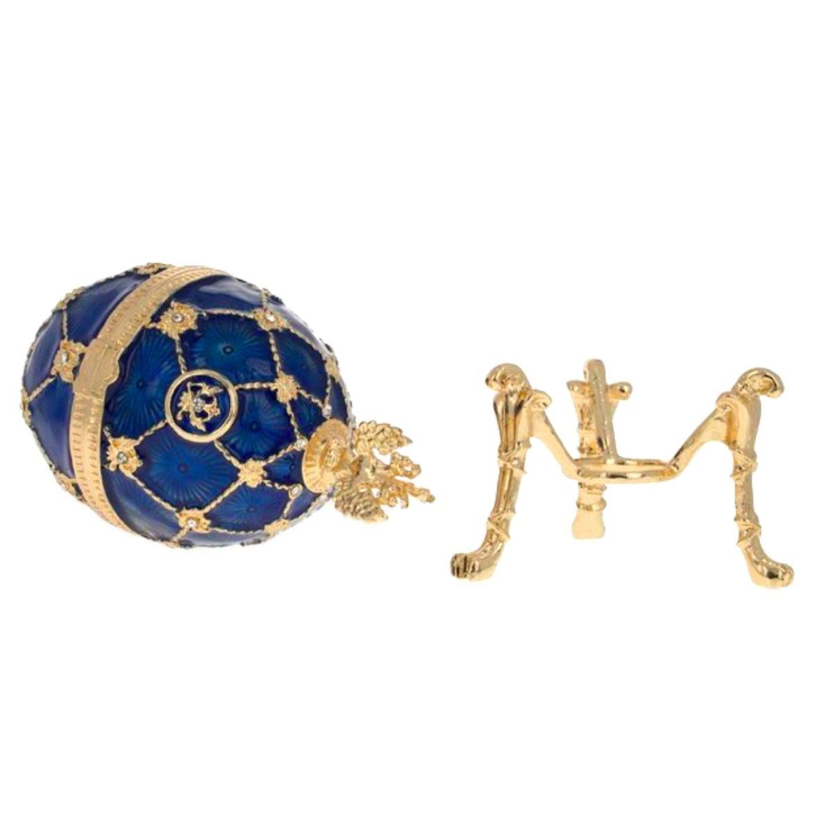 Inspired by the original designs of Carl Faberge for the Russian Royal Family, enamel & gilt over pewter with embedded Austrian crystals. The egg opens at center, with magnetic closure, to reveal an enameled interior for storing trinkets or jewels. The egg lifts off its gilt stand. 5: H X 2" D.Â
