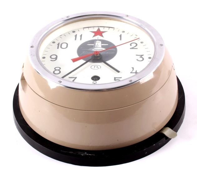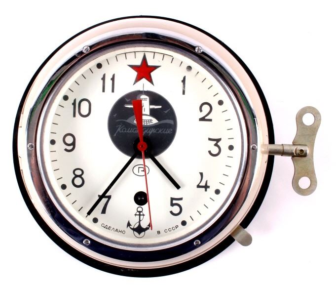 This is a Russian Cold War era submarine clock. The clock is marked in Russian "??????? B CCCP" which translates to "Made In USSR". It is also marked "Kauahguyckue". The clock is in good condition. It does come with a key and is in working condition. The clock measures 9" in diameter and is 3.5" deep.