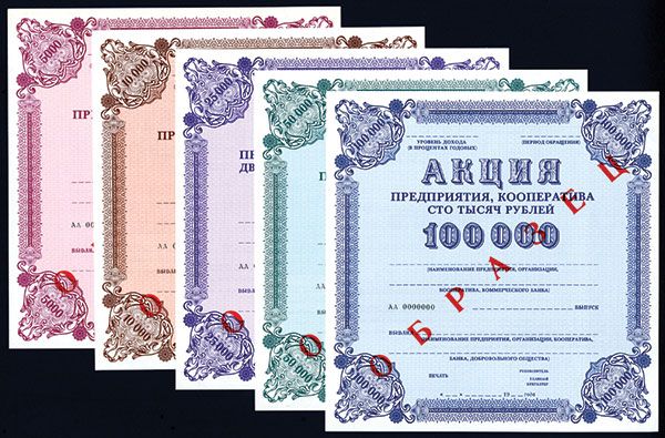 Russia (USSR), lot of 5 specimen stock certificates, with zero serial numbers and red '_______' overprints ('SPECIMEN' in Russian). Includes 5000, 10000, 25000, 50000, and 100000 Ruble certificates. UNC and unusual.