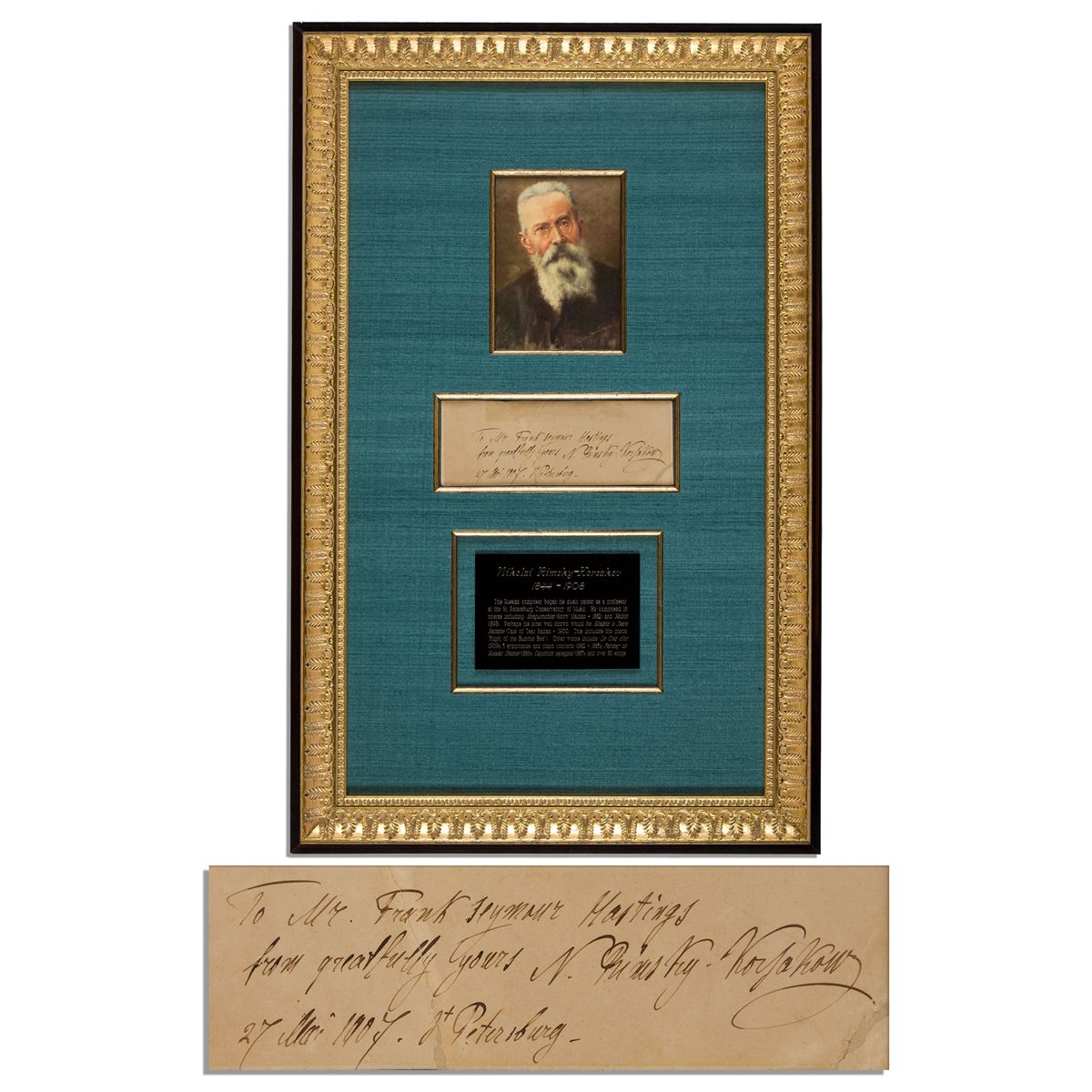 20th century Russian composer Nikolai Rimsky-Korsakov autograph note signed, dated 17 May 1907 from St. Petersburg. At this point in his career, Rimsky-Korsakov was a Russian fixture, touring Europe with his popular compositions. A year after penning this note, the virtuoso passed away. Reads in full: ''To Mr. Frank Seymour Hastings / from greatfully [sic] yours / N. Rimsky-Korsakov / 27 Mai 1907 / St. Petersburg''. Single page note measures 7'' x 2.5'', framed with a portrait and biography plaque of the composer against a turquoise mat to an overall size of 15.75'' x 24.5''. Toning, archivally repaired tear and chipping to lower right. Very good condition.
