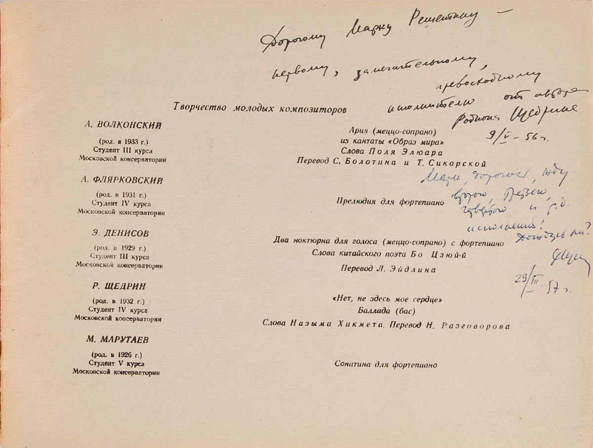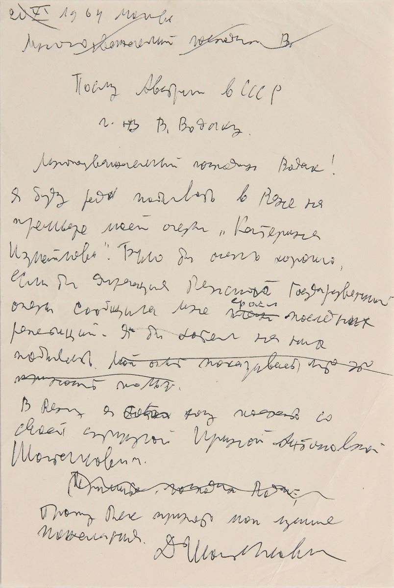 Three items: an ALS in Cyrillic by Dmitri Shostakovich, one page, November 20, 1964, to the Austrian consul in Moscow, mentioning that he would be pleased to attend the Vienna opening of his opera Catherine Izmailov, that he considers the opening to be most important, and hopes that a visa may also be arranged for his wife; a satin-finish 3.5 x 5.5 photo of Dmitri Kabalevsky, signed and inscribed in the lower border to pianist and women’s rights advocate Claudette Sorel; and a 1954 sheet music booklet, signed and inscribed on the title page to Marc Reschetnik by Rodion Shchedrin. In overall fine condition.