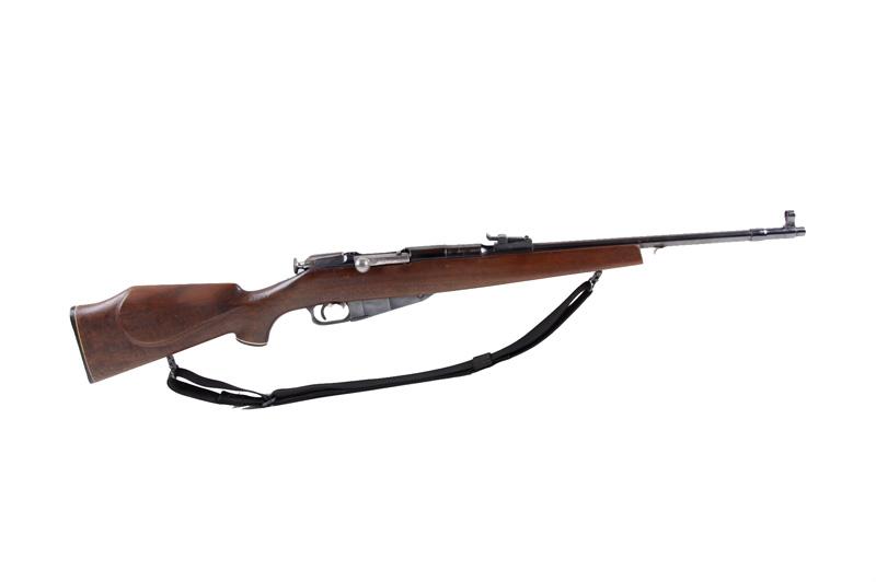 Russian Custom Mosin-Nagant Cal. 7.62x54R SN:AA8214, Bolt action Russian military rifle customized to sporting use. Blued finish, smooth wood left hand Monte Carlo style stock with hard rubber butt plate, barrel reduced to 20" with military ladder rear sSN:AA8214, Bolt action Russian military rifle customized to sporting use. Blued finish, smooth wood left hand Monte Carlo style stock with hard rubber butt plate, barrel reduced to 20" with military ladder rear sight retained and coveredpost installed in front. good bore and action. Condition: Very good to excellent as customized. Stock could be smoothed a bit.