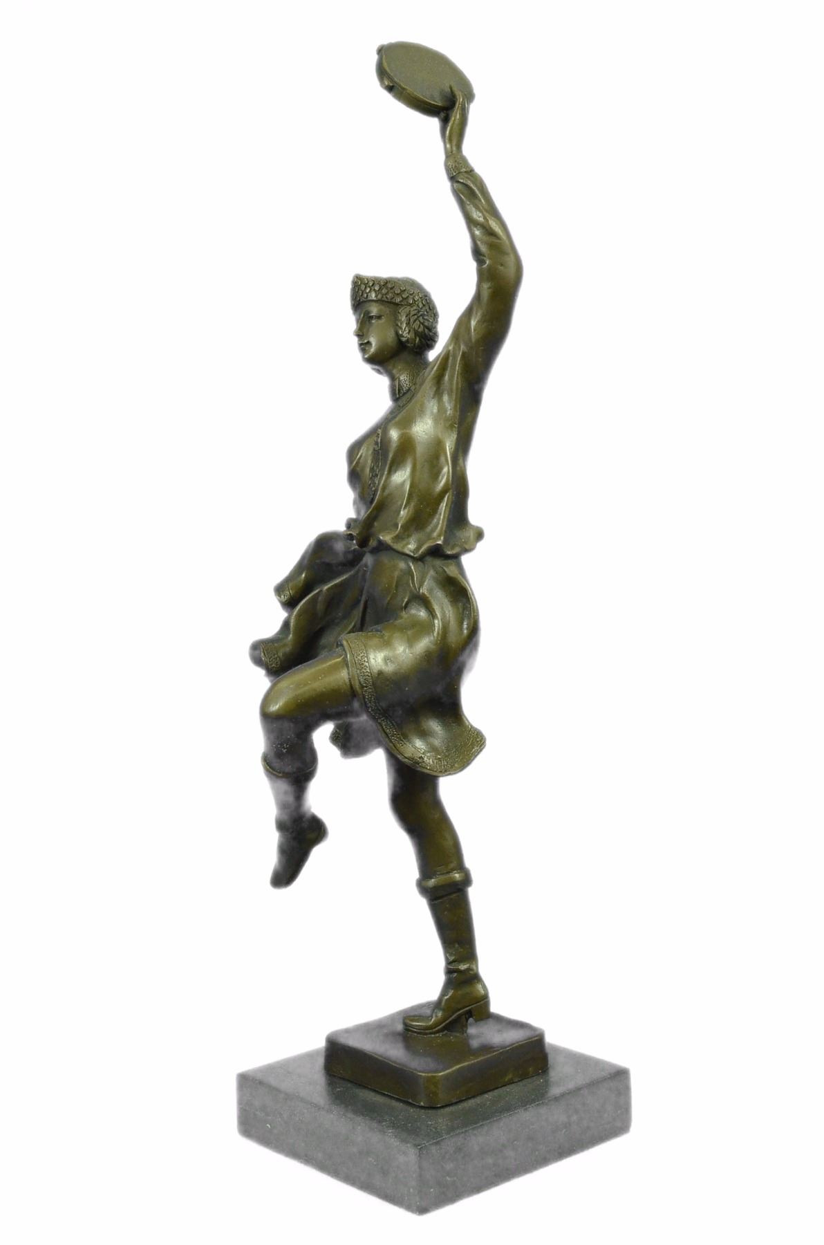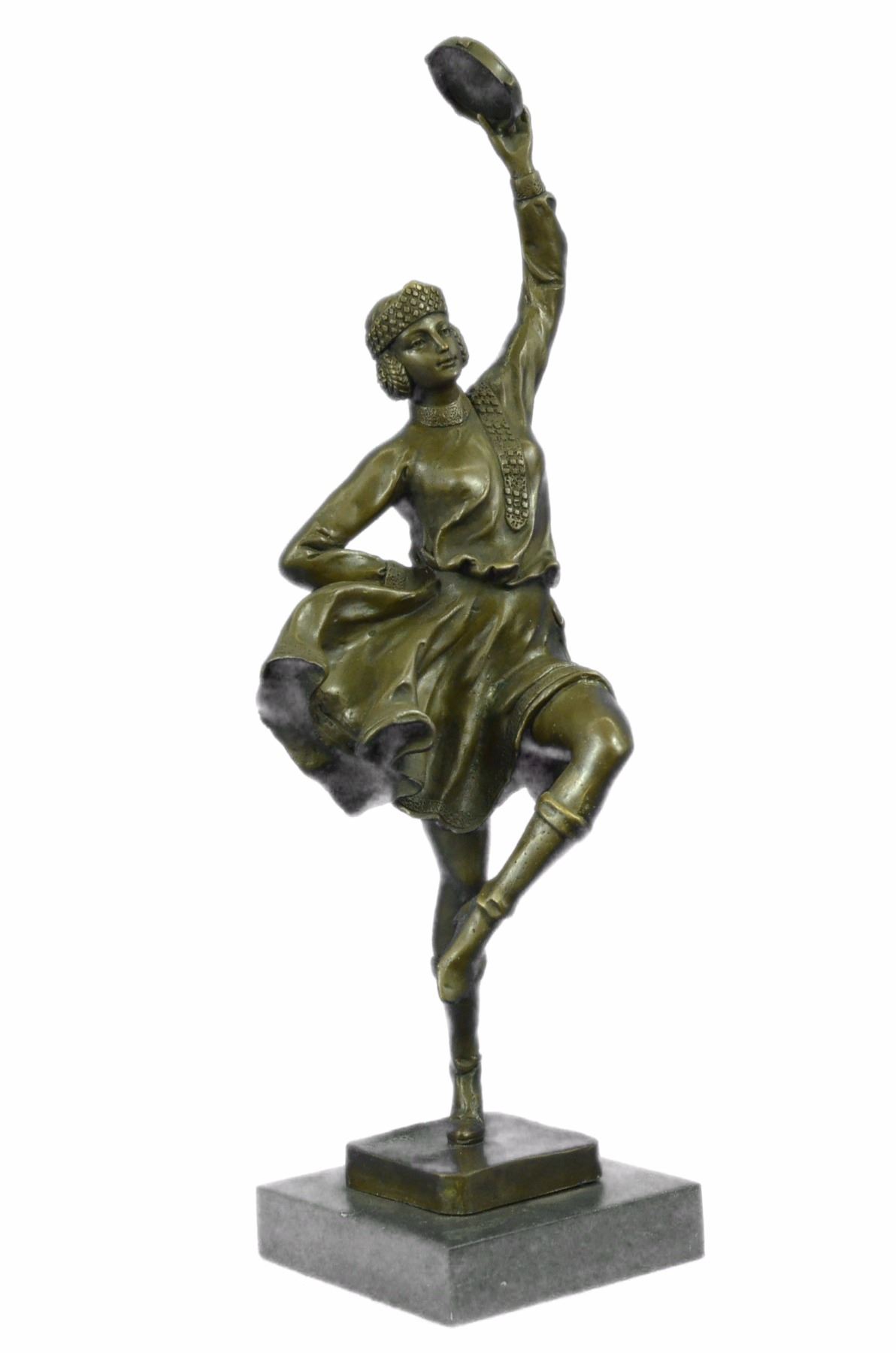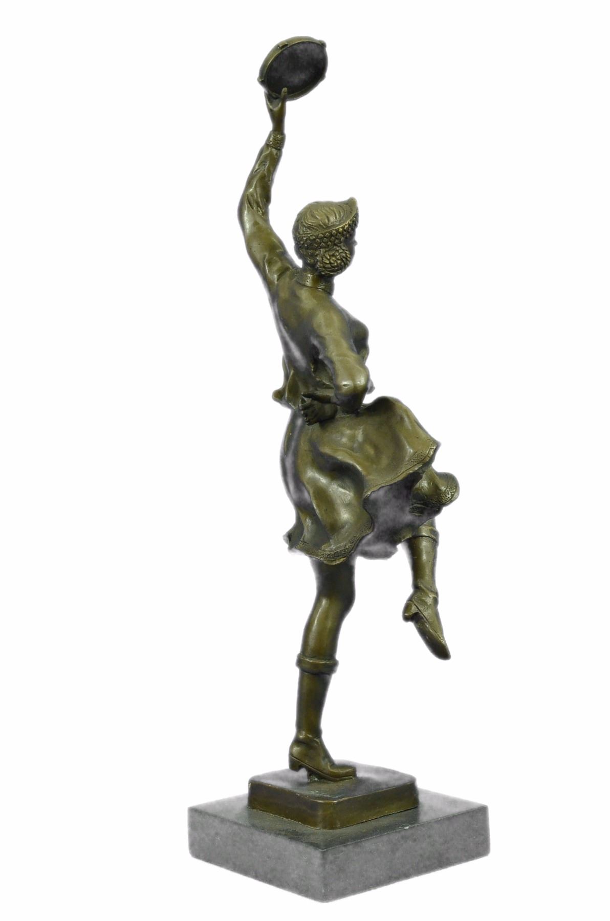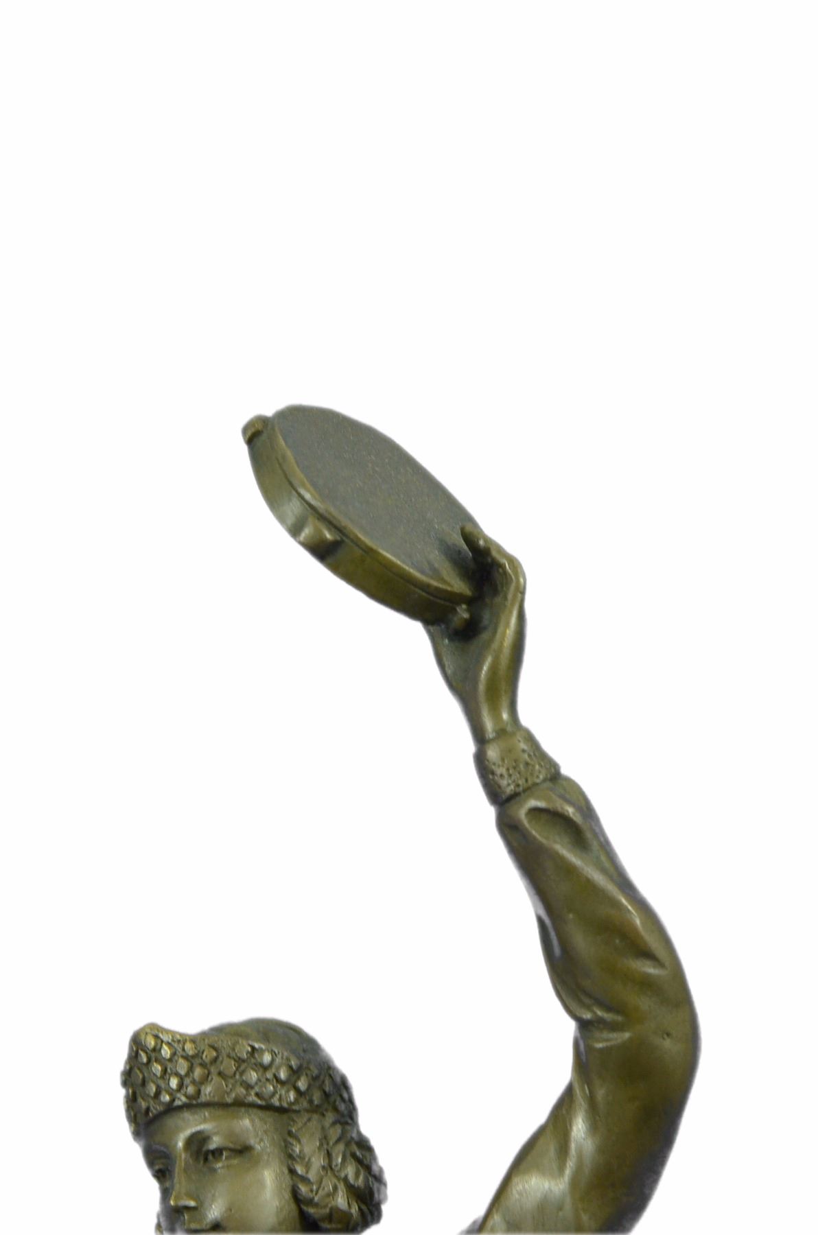 This Dancer Rhythmically Moves Her Body To The Beat Of Her Tambourine, Enchanting All Those Who Watch Her Performance. Her Loose Eloquent Dress And Minimal Jewelry Simply Define Her Beauty. She Moves Foot By Foot, Allowing The Wind To Gently Blow Her Dress, Aiding The Artist In Conveying Movement. This Handmade 100% Bronze Sculpture Was Cast Using The Lost Wax Method. This Brown Patina Was Mounted On A Black Marble Base. Size: 17X10 inches. Weight: 10 LBS.