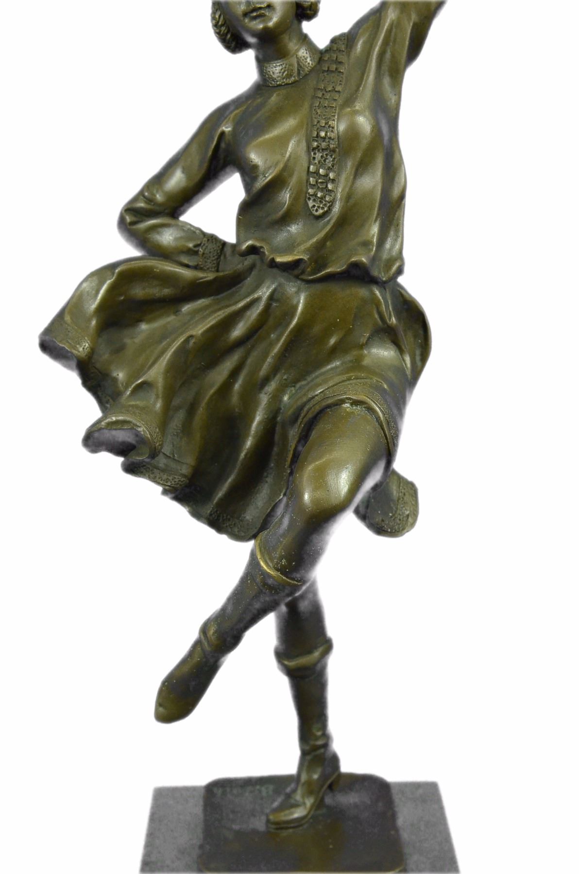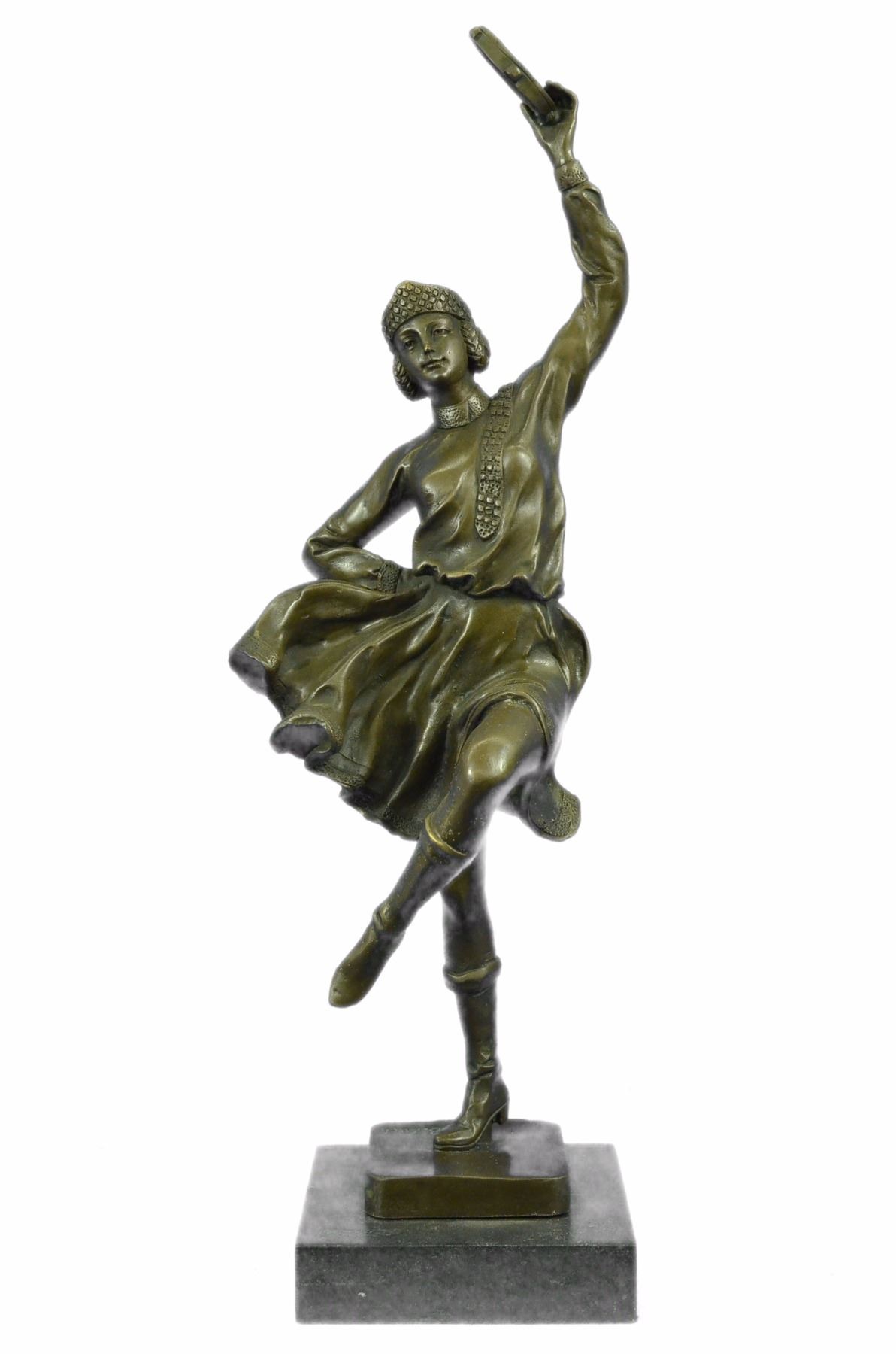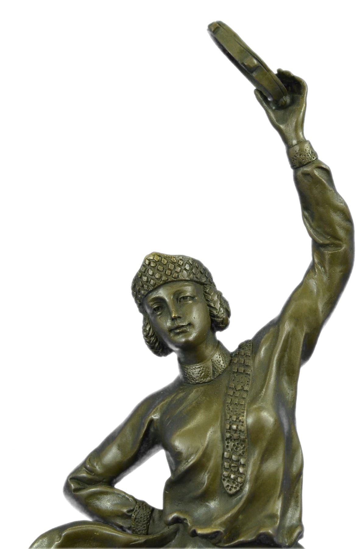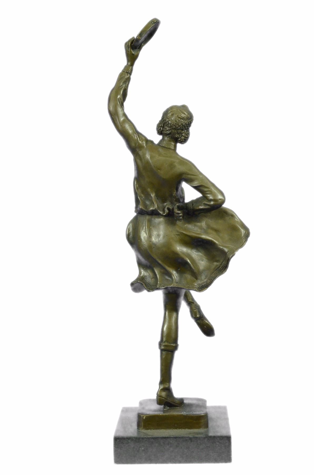 This Dancer Rhythmically Moves Her Body To The Beat Of Her Tambourine, Enchanting All Those Who Watch Her Performance. Her Loose Eloquent Dress And Minimal Jewelry Simply Define Her Beauty. She Moves Foot By Foot, Allowing The Wind To Gently Blow Her Dress, Aiding The Artist In Conveying Movement. This Handmade 100% Bronze Sculpture Was Cast Using The Lost Wax Method. This Brown Patina Was Mounted On A Black Marble Base. Size: 17X10 inches. Weight: 10 LBS.