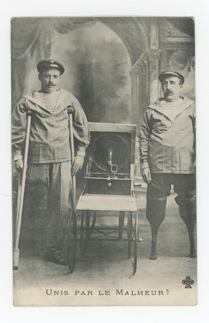 Unis par le malheur, United by Misfortune. Both soldiers standing with a gramophone on a Wheelchair.