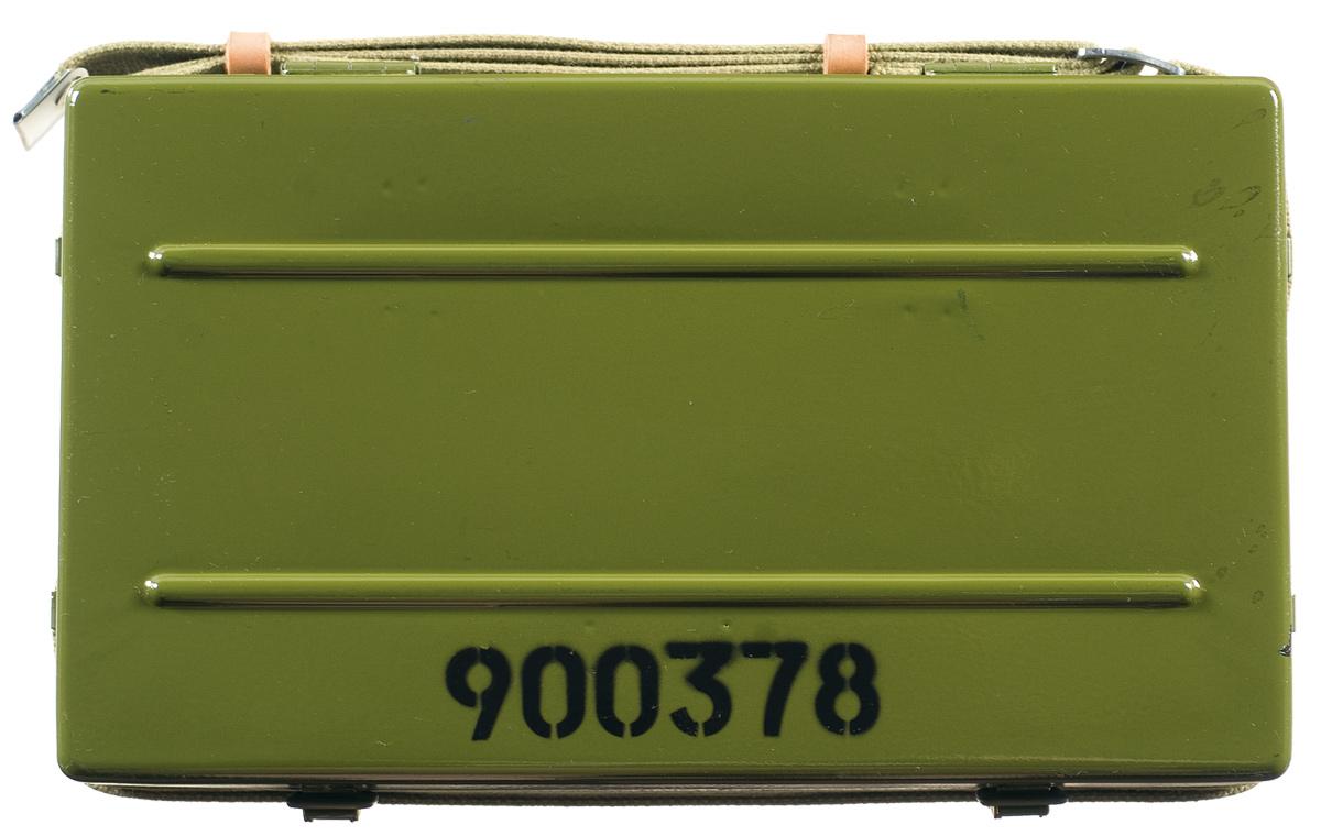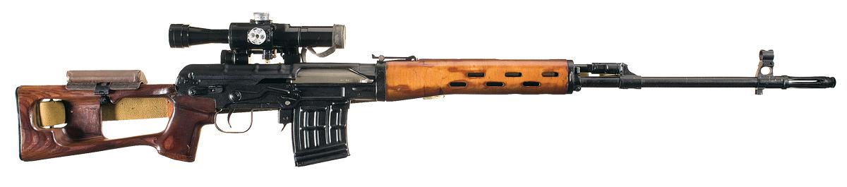 Introduced in 1964, variants of the Dragunov SVD remain in service with Russia and other nations. Hooded pin front and tangent rear sights, with the "arrow in triangle" arsenal mark over "1985" and the serial number on the underside of the receiver, with matching numbers on the component parts. Mounted on the let side of the receiver is the PSO-1 4x scope with illuminated reticle (battery not included). Smooth thumbhole stock with a vented forearm, tan canvas sling, flat buttplate and a clamp on leather cheekpiece. With a green painted steel case for the scope and a rubber eyepiece. Included is a second cased scope, a 1PN58 night vision scope. The scope comes with a metal case and accessories. The rifle is free of any import markings.