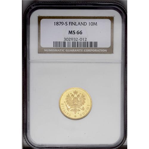 <B>Russian Duchy gold 10 Markkaa 1879S,</B></I> KM-8.2, MS66 NGC. A lustrous Gem.